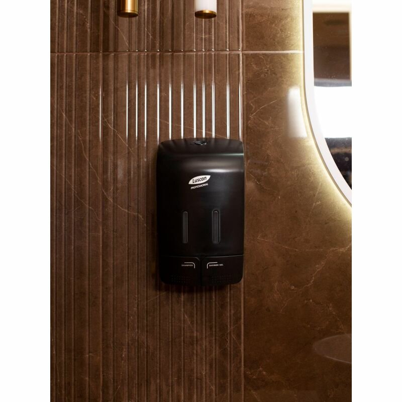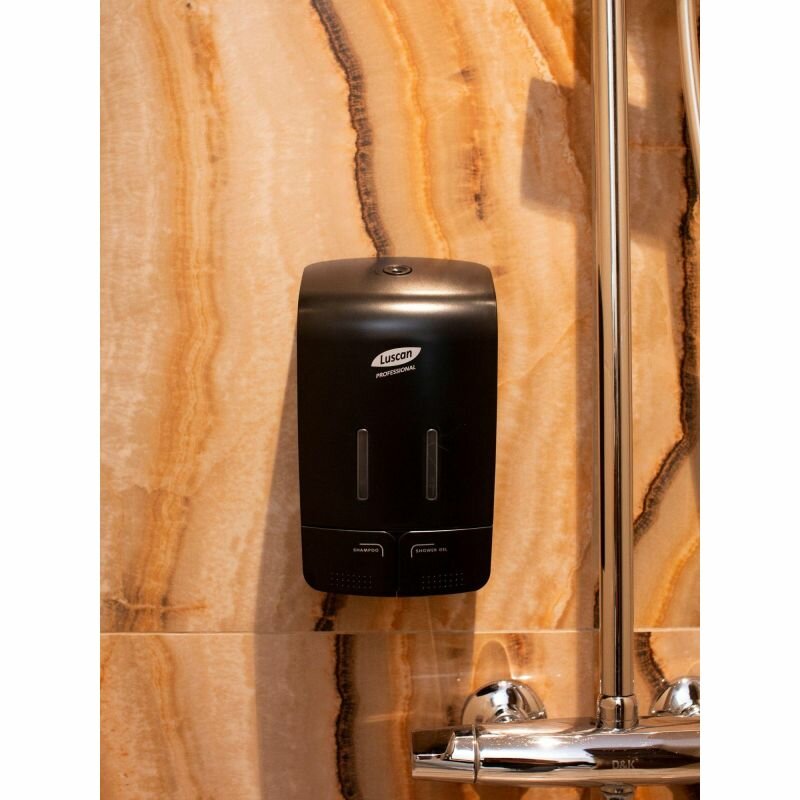 Двухкамерный дозатор для жидкого мыла/геля/шампуня Luscan Professional Etalon пластиковый черный 2x0,55 л Особенности: Дозатор двухкамерный Luscan Professional Etalon отлично подходит для использования дома или в отелях. В двухкамерный дозатор можно налить жидкое мыло, гель для душа или шампунь и одновременно использовать два средства. Дозатор предназначен для крепления к стене и подходит для любого дизайна ванной комнаты. Дозатор имеет компактный размер и удобные кнопки нажатия. Изготовлен из прочного ABS-пластика. Объем дозатора: 2x550 мл. Вид диспенсера: механический. Вид крепления: настенное. Страна-изготовитель: Китай. Габаритные размеры (ВхШхГ): 145x96x250 мм Материал: ABS-пластик, полипропилен. Цвет: черный. Комплект поставки: диспенсер, инструкция, комплект креплений, ключ. Гарантийный срок: 1 год.