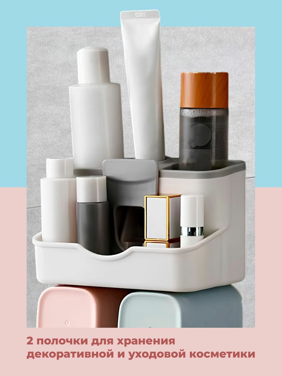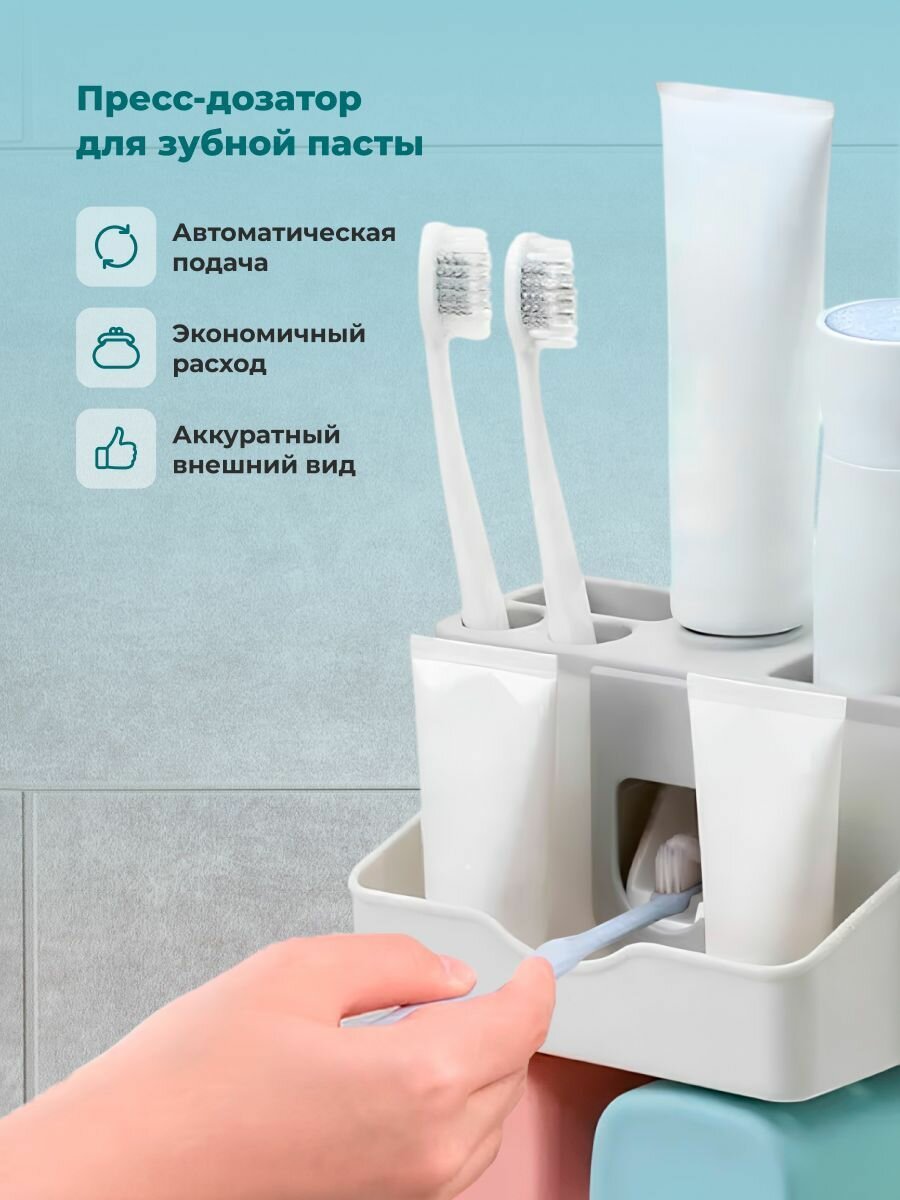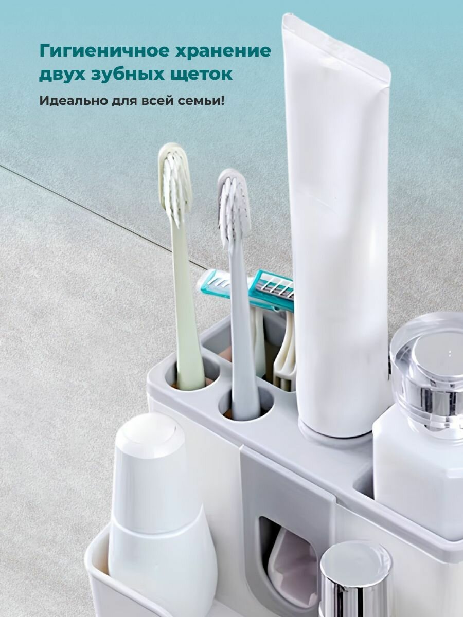 Настенный держатель зубных щеток — отличный вариант аккуратной и красивой организации в ванной комнате. Больше никаких стаканчиков и тюбиков по краям раковины — теперь все предметы гигиены находятся в одном стильном органайзере для щеток и зубной пасты. Он крепится на стену с помощью клеевой ленты, поэтому не придется сверлить дыры. Можно клеить на плитку, стекло, металл и дерево. Семейный диспенсер выполнен из прочного AБC пластика и выдерживает нагрузку до 6 кг. Имеет несколько отделов, куда можно поставить уходовые средства, пресс дозатор для зубной пасты, 2 стаканчика для полоскания на магните и держатель для 2 зубных щеток. Несмотря на то, что внутрь помещается так много всего, диспенсер компактный и занимает минимум места. Пресс дозатор экономит расход зубной пасты, так как выдавливает ее до последней капли, за счет механизма. Органайзер подходит для обычных и электрических зубных щеток. Они находятся в отдельных ячейках, поэтому такой способ хранения еще и очень гигиеничный. Наш держатель поможет вам превратить хаос из тюбиков в красивый и удобный настенный уголок!