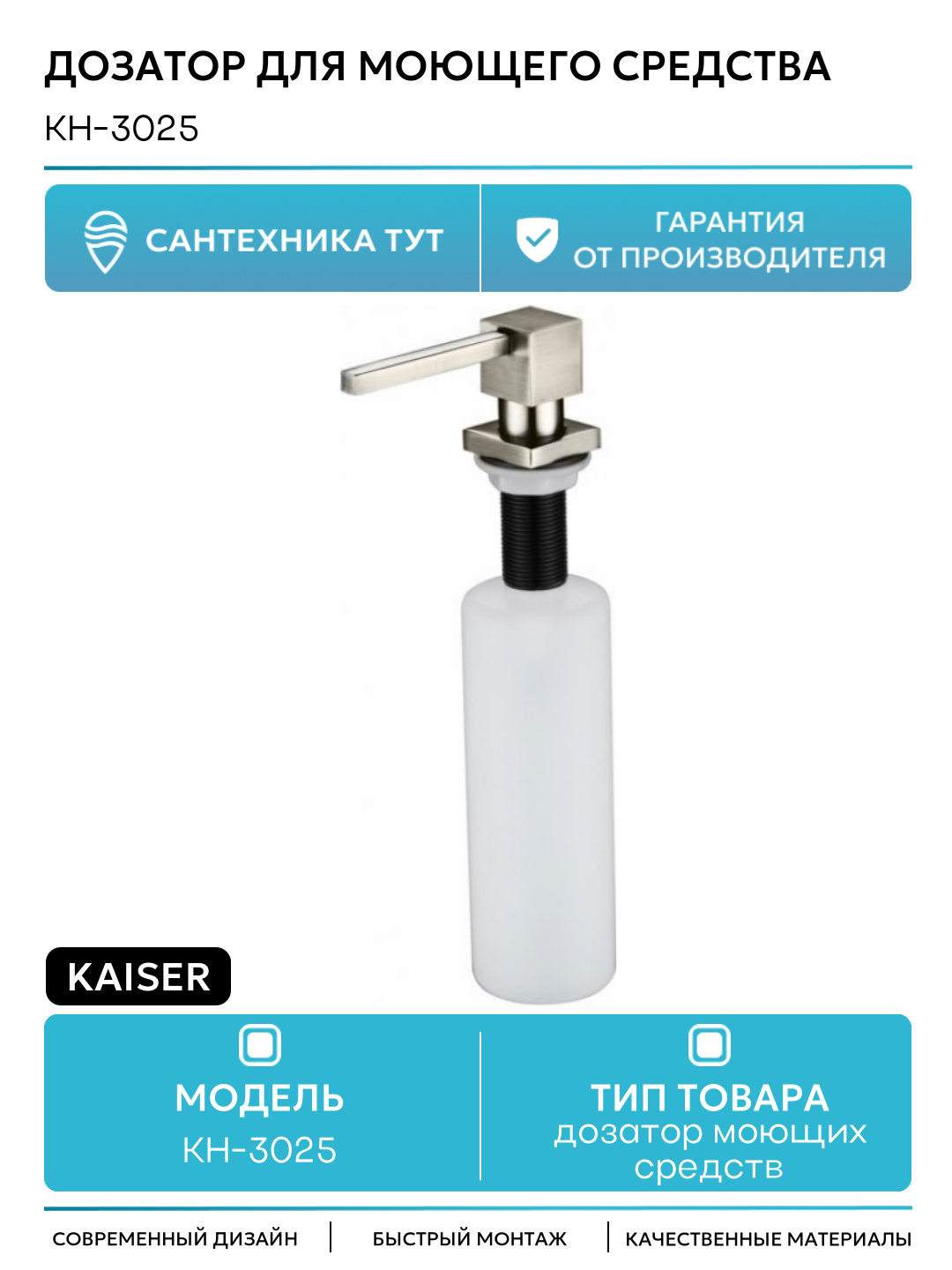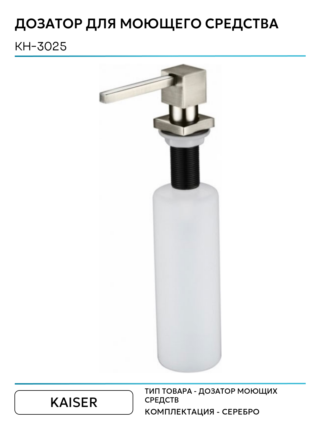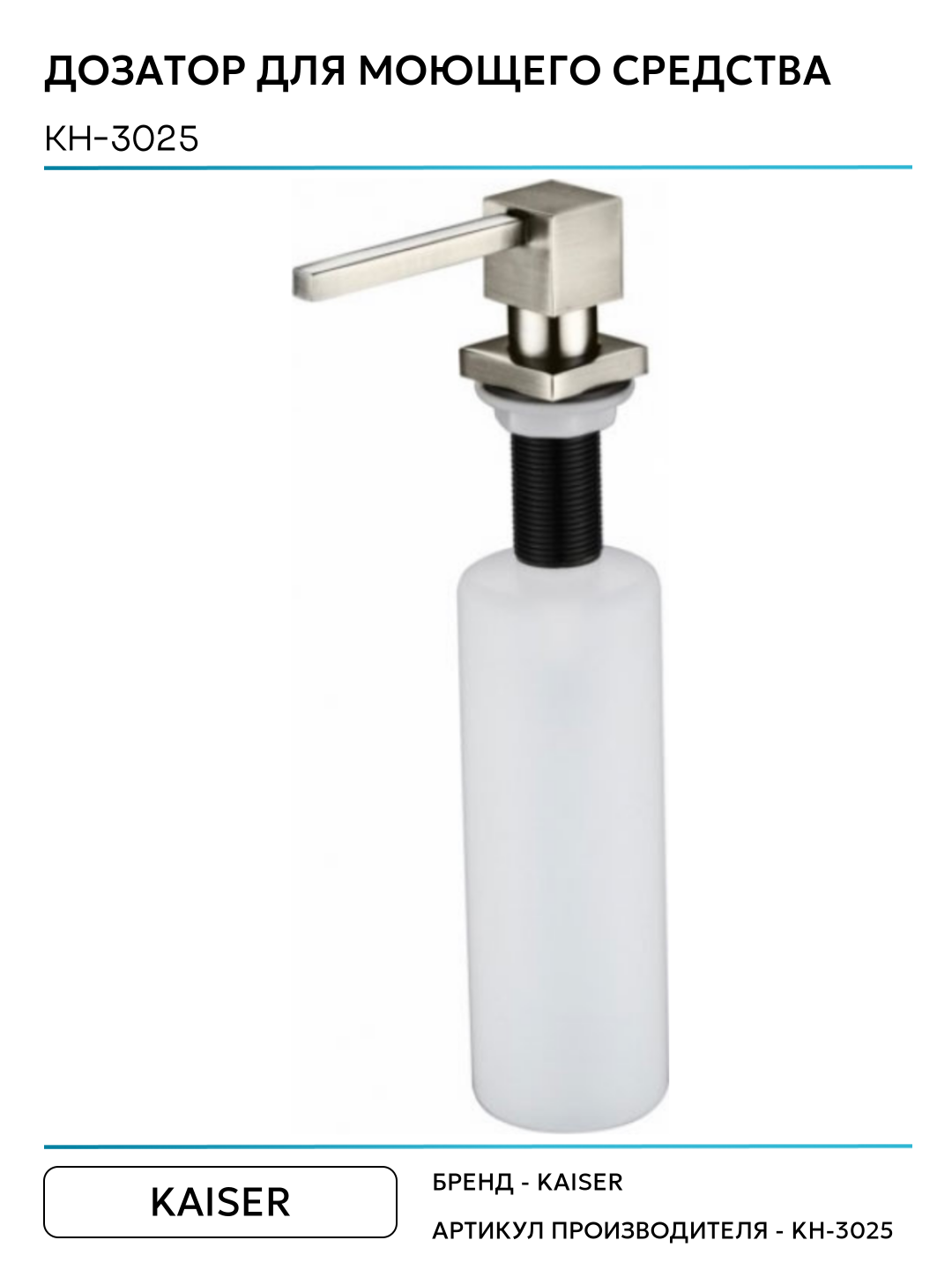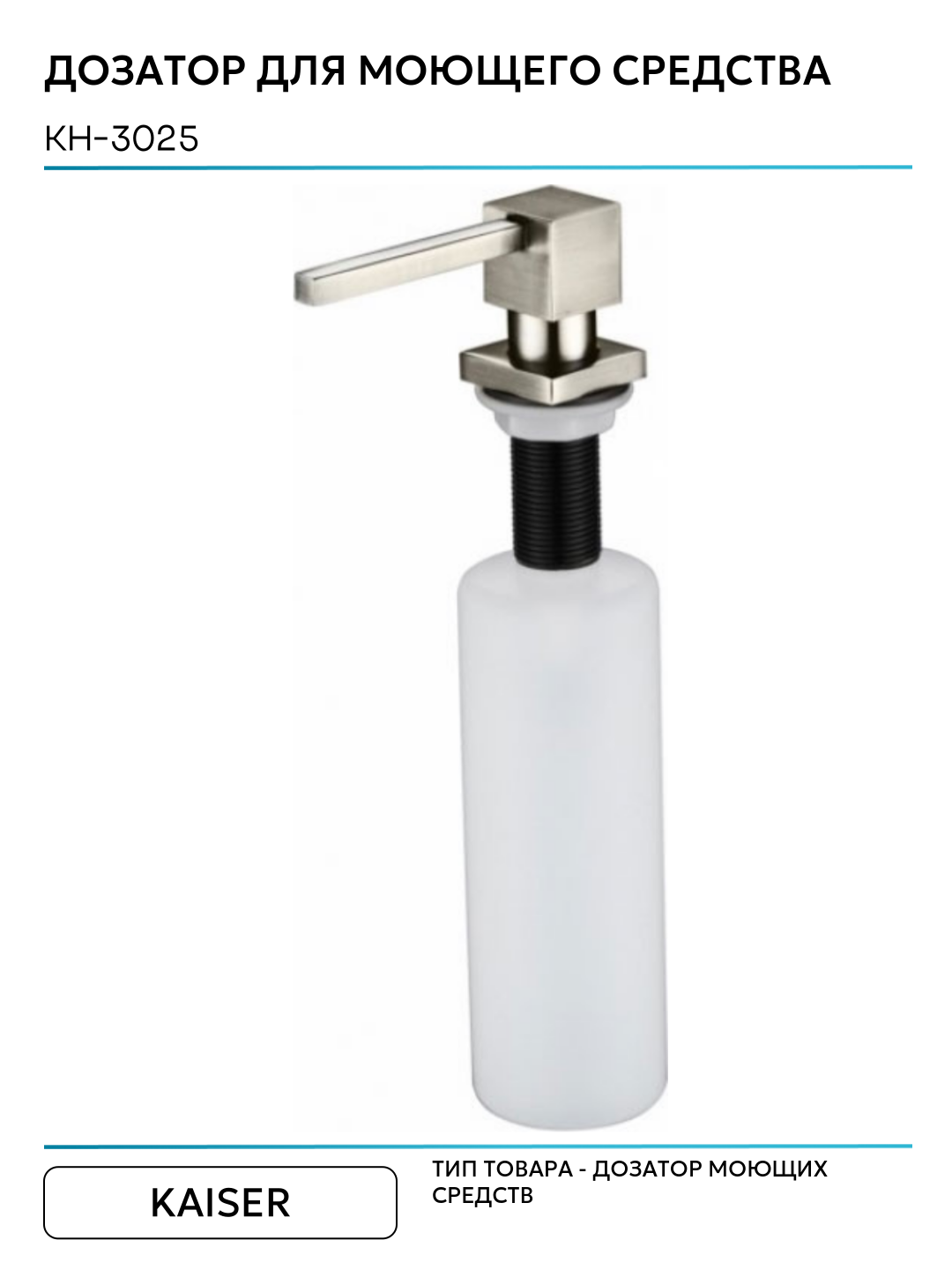 Встраиваемый дозатор KAISER KH-3025 - отличный выбор для тех, кто ищет удобный и стильный способ хранения жидкого мыла и моющих средств на кухне. Он отличается высокой производительностью и надежностью, что делает его идеальным выбором для использования в домашних условиях.