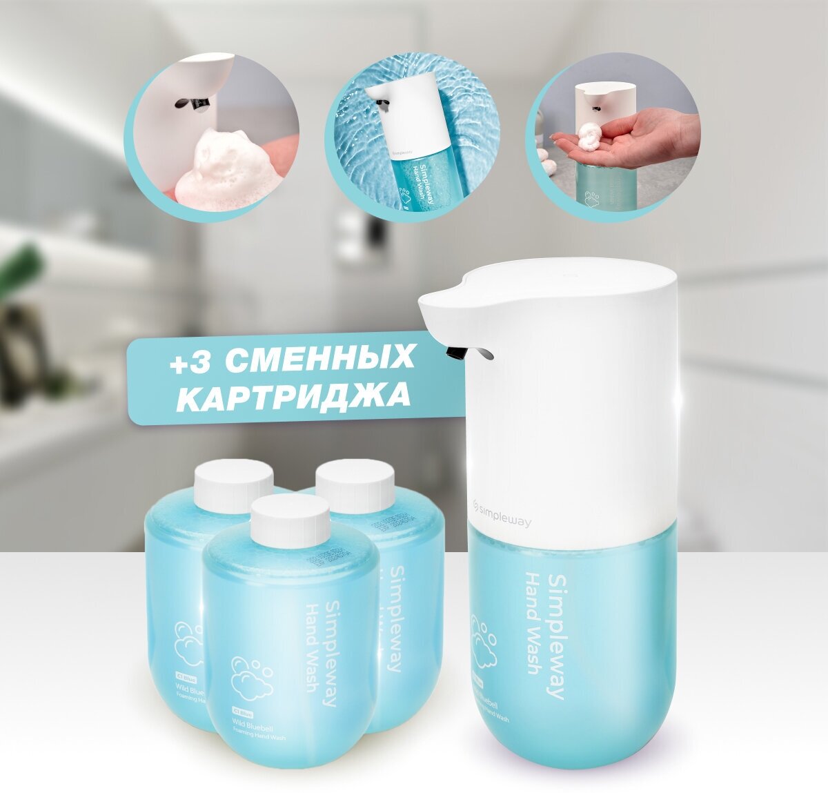 Автоматический дозатор (диспенсер) для мыла Simpleway + 3 сменных картриджа станет прекрасным аксессуаром для вашей ванной комнаты или кухни, справится с 99% всех микробов. Модель оборудована инфракрасным сенсором, благодаря которому не придется нажимать кнопку, а это чудесная особенность для поддержания гигиены. Корпус изготовлен из надежного, ударопрочного пластика. Питание устройства осуществляется от трех батареек типа АА. Содержащееся в дозаторе мыло эффективно справляется с 99.9% микробов. Специально подобранный состав мыла, приближающийся к естественному для кожи показателю pH, не нанесет вреда кислотно-щелочному балансу кожных покровов даже при длительном использовании, а также значительно смягчит их. Добавление экстрактов растений предоставит коже еще большую защиту. Объем: 3 * 300 мл. Блок подходит для диспенсера Xiaomi Mi.