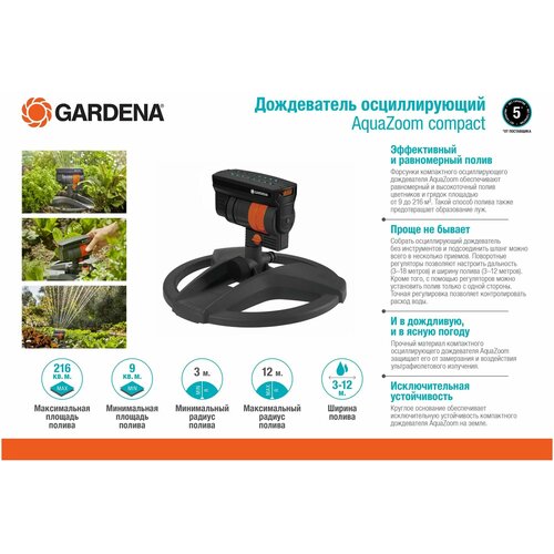 Дождеватель AquaZoom Compact на подставке от GARDENA позволит сэкономить ваши силы и время, взяв на себя полив огородных грядок и цветочных клумб. А главное, равномерный полив, обеспечиваемый осциллирующим дождевателем, гарантирует высочайшее качество ваших растений и овощей. Точные насадки предотвращают образование луж. Наслаждайтесь каждым мгновением лета! Дождеватель оснащён круглым основанием, придающим ему устойчивость на земле. Благодаря такой конструкции его удобно размещать посредине огородной грядки, чтобы получить равномерный полив. Дождеватель AquaZoom Compact покрывает обширную площадь от 9 до 216 кв. м. Ползунок позволяет устанавливать дальность и ширину полива. Использование высококачественных материалов означает, что вы можете рассчитывать на 2-х летнюю гарантию от производителя, дополняющую изготовление в Германии, а также на то, что ни мороз, ни УФ-излучение не повредят ваш дождеватель GARDENA. Обслуживание дождевателя так же просто, как и его эксплуатация. Насадки изготовлены из мягкого пластика, что значительно упрощает очистку. Если на них скопилась известь, её можно просто удалить, проведя пальцем по насадкам. Кроме того, в соединение подачи воды встроен фильтр для сбора частиц грязи. Его можно легко снять и промыть под струёй воды.