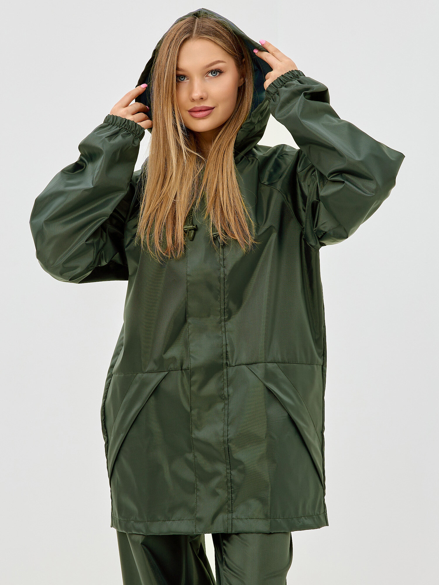 Центральная молния и карманы закрываются влагозащитными планками. На манжетах и внизу брюк расположены широкие резинки, которые также не дадут влаге проникнуть внутрь костюма.