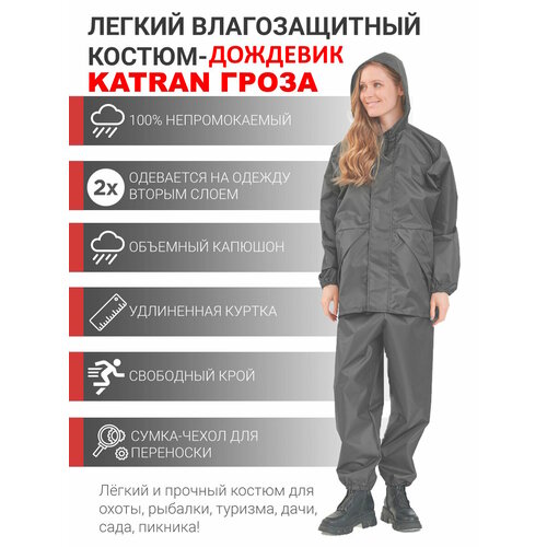 Влагозащитный костюм KATRAN циклон – это незаменимая вещь для всех любителей активного отдыха. Костюм состоит из куртки с капюшоном и брюк. Вес комплекта составлет всего 0.94 кг, и в сложенном виде костюм практически не занимает места. В качестве основной ткани используется Oxford 240D PU покрытием, который не даст одежде намокнуть.