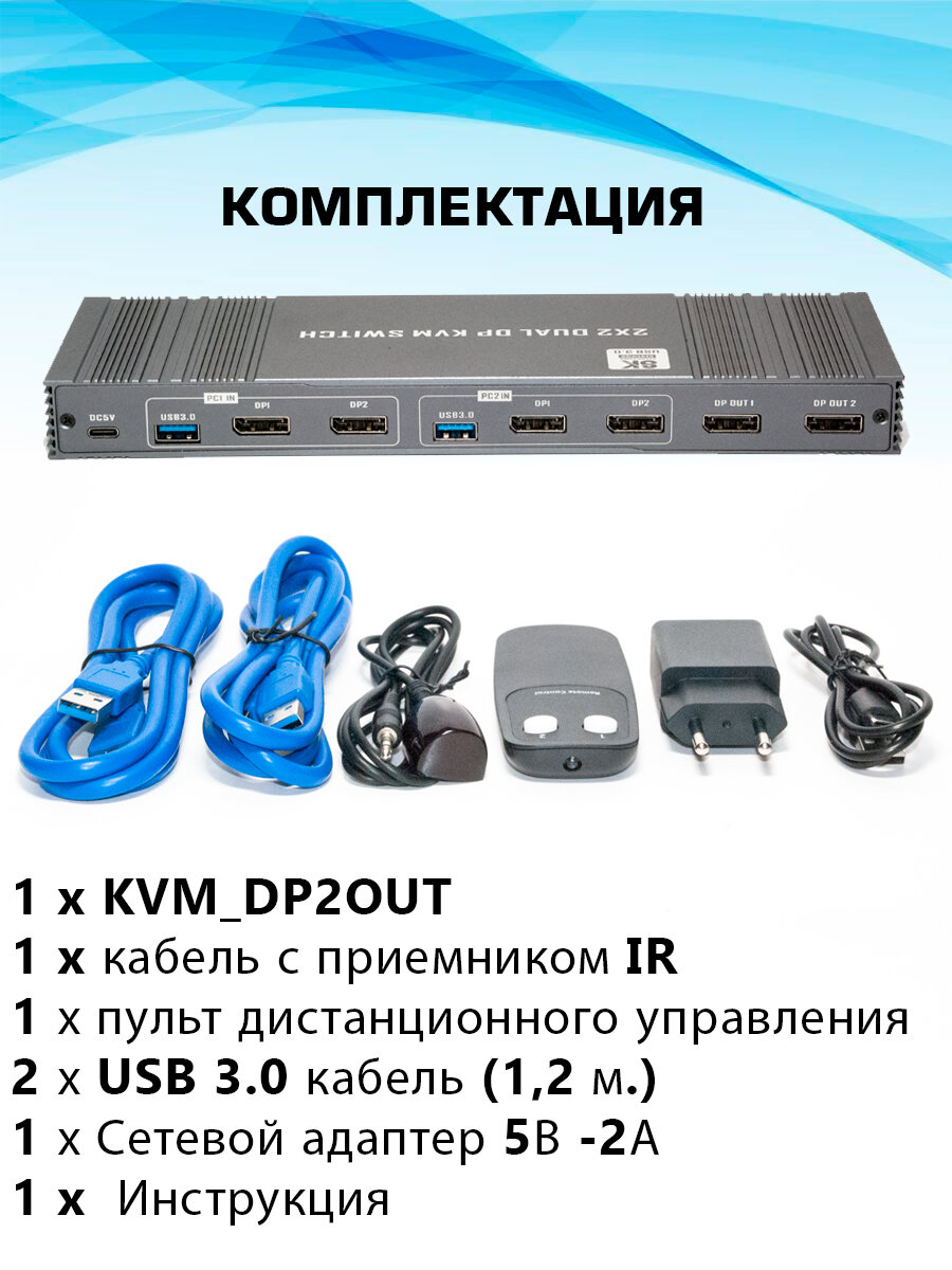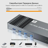 Переключатель позволяет двум компьютерам выводить картинку на 2 монитора DP 1.4 и 3 порта USB 3.0, такие как мышь, клавиатура, принтер, (убедитесь, что каждый подключенный компьютер поддерживает многоэкранный дисплей и 2 Display Port)