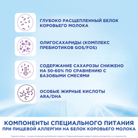 | Состав | гидролизованный концентрат белков молочной сыворотки, мальтодекстрин, смесь растительных масел (пальмовое, рапсовое, кокосовое, подсолнечное, масло из Mortierella alpina), галактоолигосахариды, эмульгатор – эфир глицерина и лимонной и жирных кислот, фруктоолигосахариды, источники минеральных веществ (кальция фосфат, калия хлорид, натрия цитрат, магния хлорид, карбонат кальция, сульфат железа, цинка сульфат, сульфат марганца, сульфат меди, йодид калия, селенит натрия), источники витаминов (L-аскорбиновая кислота, L-аскорбат натрия, DL-альфа-токоферола ацетат, никотинамид, кальция D-пантотенат, D-биотин, фолиевая кислота, ретинола пальмитат, DL-альфа-токоферол, тиамина гидрохлорид, рибофлавин, пиридоксина гидрохлорид, холекальциферол, фитоменадион, цианокобаламин), рыбий жир, холина хлорид, нуклеотиды (уридина 5-монофосфат, цитидина 5-монофосфат, аденозина 5-монофосфат, инозина 5-монофосфат, гуанозина 5-монофосфата натриевая соль), инозитол, L-карнитин, таурин. Может содержать следы сои. |