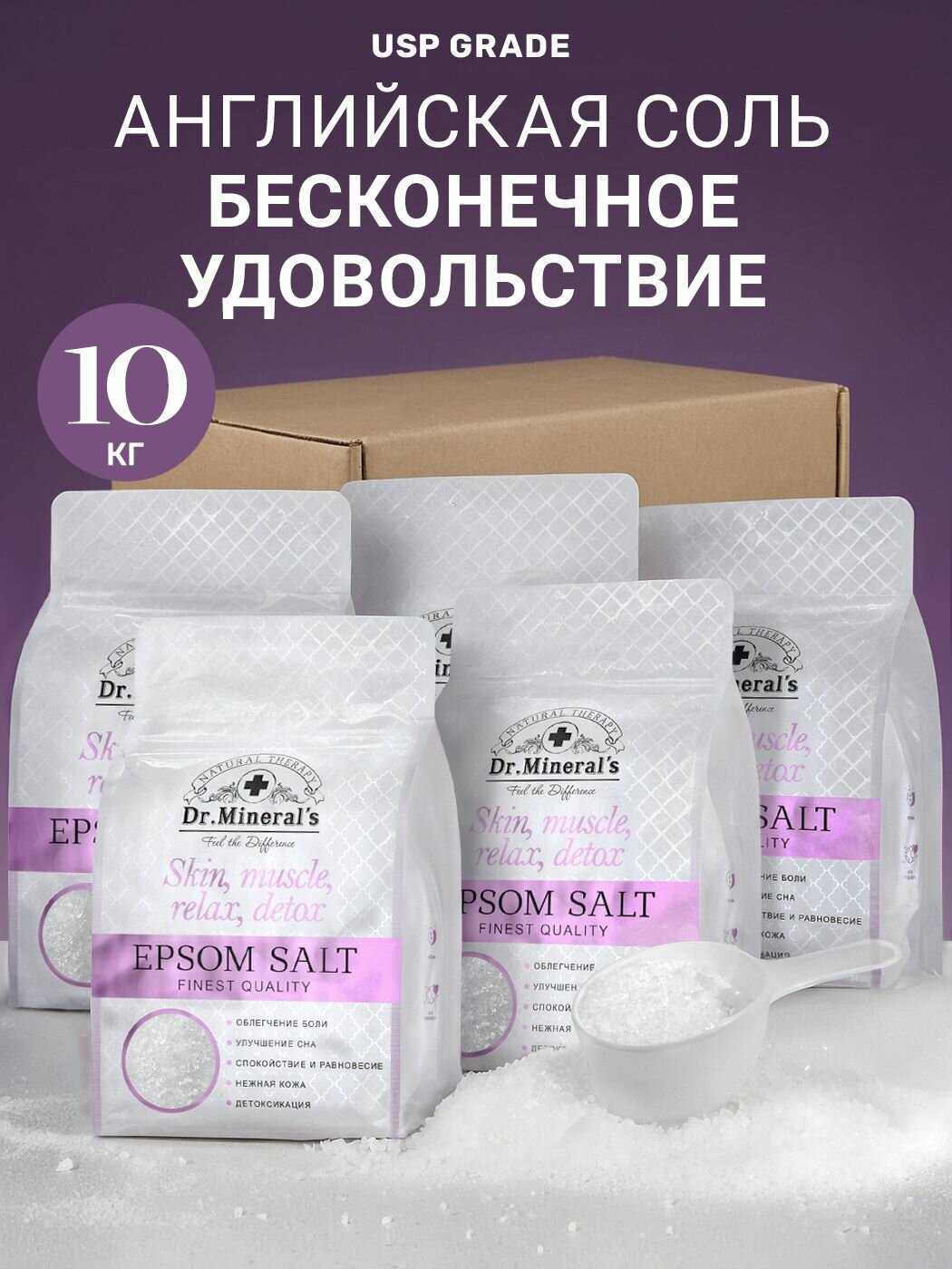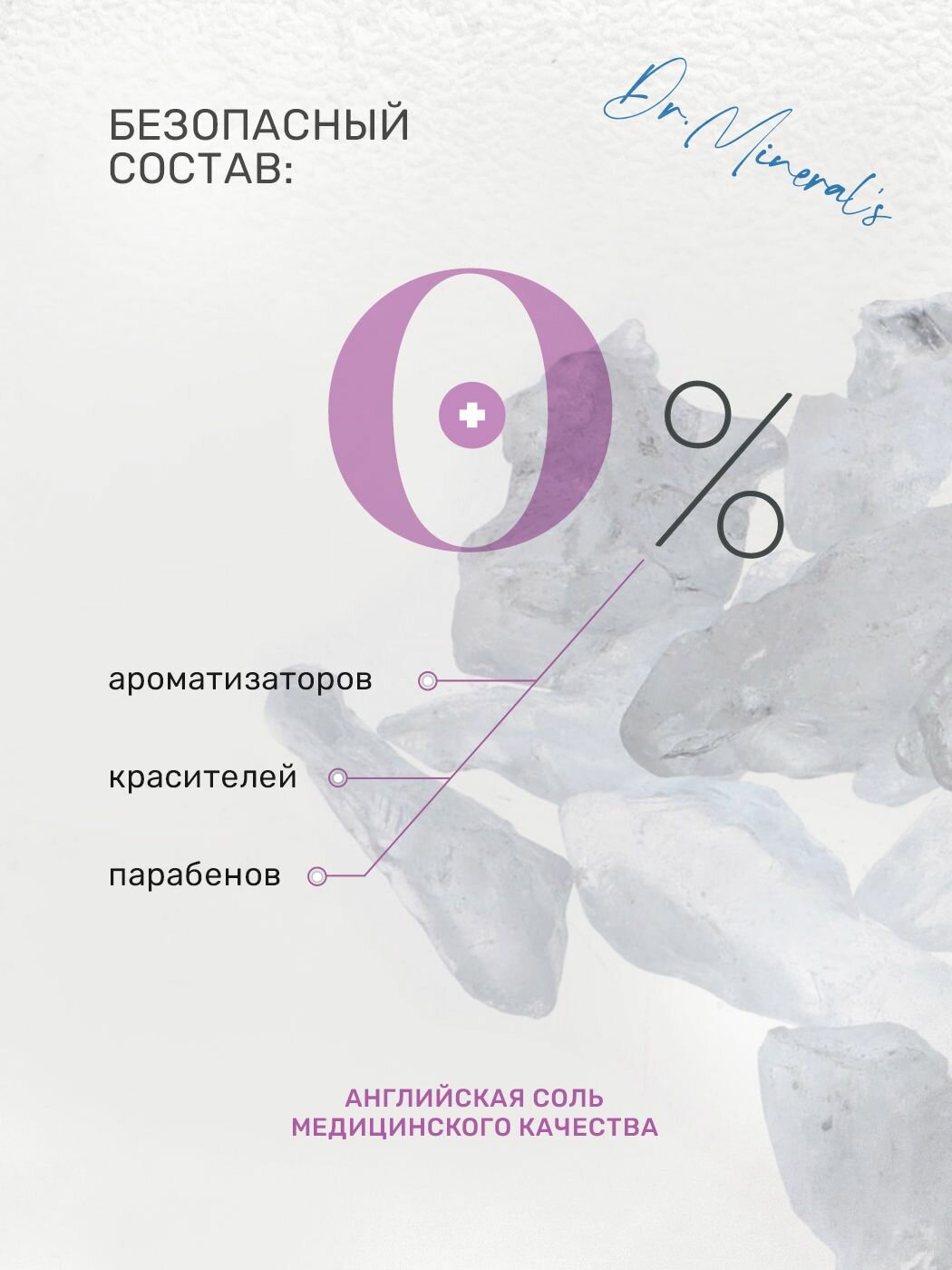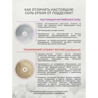 Английская соль «Еpsom» от Dr. Mineral’s продукт высочайшего качества, произведённая специально для применения в косметологии. Содержание активного вещества доходит до 99,9%. Только такая соль способна принести пользу вашему здоровью. Соль Эпсом уже сотни лет является источником полезнейших элементов, содержит в себе магний, который участвует во многих процессах, происходящих в организме - в выработке энергии, усвоении глюкозы, передаче нервного сигнала, синтезе белков, построении костной ткани, регуляции расслабления и напряжения сосудов и мышц.