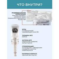 Как подобрать картридж к дермапен? Количество игл в картридже влияет на диаметр проколов, которые они совершают в процессе работы аппарата. Чем меньше игл на насадке картриджа, тем больший прокол в диаметре каждая из них производит, и тем больше травмируется кожный покров. Соответственно: чем меньше игл – тем глубже и эффективнее проникает используемый в процессе обработки кожи мезококтейль сыворотка, но и процедура происходит при этом более ощутимо и жестко в плане болевого эффекта. Поэтому в случае повышенной болевой чувствительности лучше выбрать картридж с большим количеством игл. Картриджи 12 игл, когда игл мало, работает жестче, поэтому лучше подходит для возрастной и уплотненной, толстой кожи. Для ухода за такими кожными несовершенствами как различного рода рубцы (акне, растяжки, шрамы, ожоговые участки рубцовой ткани и тп). Также используются для борьбы с глубокими морщинами и заломами кожи. Подходят для агрессивного экспресс омоложения женщин с высоким болевым порогом. Для борьбы с пигментацией. Насадки лучше всего способствуют проникновению более вязких составов. Но и по ощущениям они самые травматичные. Картриджи 24 иглы можно выбрать, если 12 игл не подошли из-за повышенной чувствительности. Работает мягче и менее болезненно. Существенных различий по структуре проколов и их эффективности в подаче состава в кожу нет. Они также подойдут для ухода и для профилактики процессов старения кожи, особенно - при низком болевом барьере. Картриджи 36 игл сравнительно с предыдущими насадками у такого картриджа уже более уплотненные многочисленные ряды игл, проникающая способность которых соответственно более снижена. Болевое воздействие еще меньше. Подходит для тонкой молодой кожи при обще омолаживающих, профилактических процедурах против первых морщин или для восприимчивой, чувствительной кожи, которой не подошли насадки с 12 или 24 иглами. Эффективны в борьбе с потерей волос, при облысении (алопеции) у мужчин и женщин, способствуют росту волос на голове, сокращают выпадение волос. Картриджи 42 иглы хорошо подходят для увлажняющих и биоревитализационных процедур против стянутости любого типа кожи, можно использовать в области вокруг глаз. Эффективны при использовании в борьбе с целлюлитом на теле и по телу, а также для омоложения зоны декольте, рук. Картриджи нано используются для процедуры bb glow и поверхностного «вбивания» сывороток.