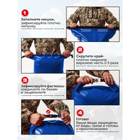 Верх драйбега фиксируется на липучку и фастекс. Через сложенную в несколько раз горловину гермомешка, не просочится влага, потому что плотно прижатые друг к другу гладкие внутренние стенки надежно перекрывают все пути сырости.
