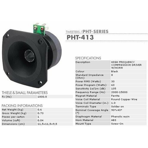 PHT-413 - это рупорный твитер, разработанный для использования в трехполосных системах или в небольших высокоэффективных двухполосных конструкциях. PHT-413 имеет высокую чувствительность SPL 105 дБ на один ватт и один метр. Это делает PHT-413 отличным выбором по сравнению с обычными купольными твитерами прямого излучения, когда требуется высокая акустическая мощность и КПД без сужения рабочей полосы пропускания. PHT-413 имеет повышенную чувствительность даже на частотах свыше 20 кГц. Это обеспечивается сочетанием обычного центрального фазовыравнивающего элемента в форме пули с дополнительным кольцевым элементом. Такая конструкция создает два концентрических кольцевых волновода в горле рупора, что позволяет получить более синфазный волновой фронт и уменьшить потери при боковых переотражениях. Это делает PHT-413 воистину супер твитером и, в сочетании с продуманной и опробованной конструкцией, высокими показателями чувствительности и выходной мощности означает, что PHT-413 пригоден для применения там, где обычные пищалки прямого излучения не способны обеспечить требуемых характеристик конечного изделия. Высокочастотный рупор представляет собой отливку из ударопрочного АБС с добавкой стекловолокна для повышения структурной жесткости и механического демпфирования. Диафрагма диаметром 1 дюйм (25,4 мм) и заводская технология сборки, разработанные компанией P Audio, делают PHT-413 отличным выбором для музыкальных систем высокой верности воспроизведения в ресторанах, пабах, мини-спортзалах и торговых точках. Небольшой физический размер PHT-413 делают это устройство превосходным выбором для применения как в автомобильных системах звукоусиления, так и в мощных компактных двухполосниках с мидбасом в 8 или 10 дюймов.
