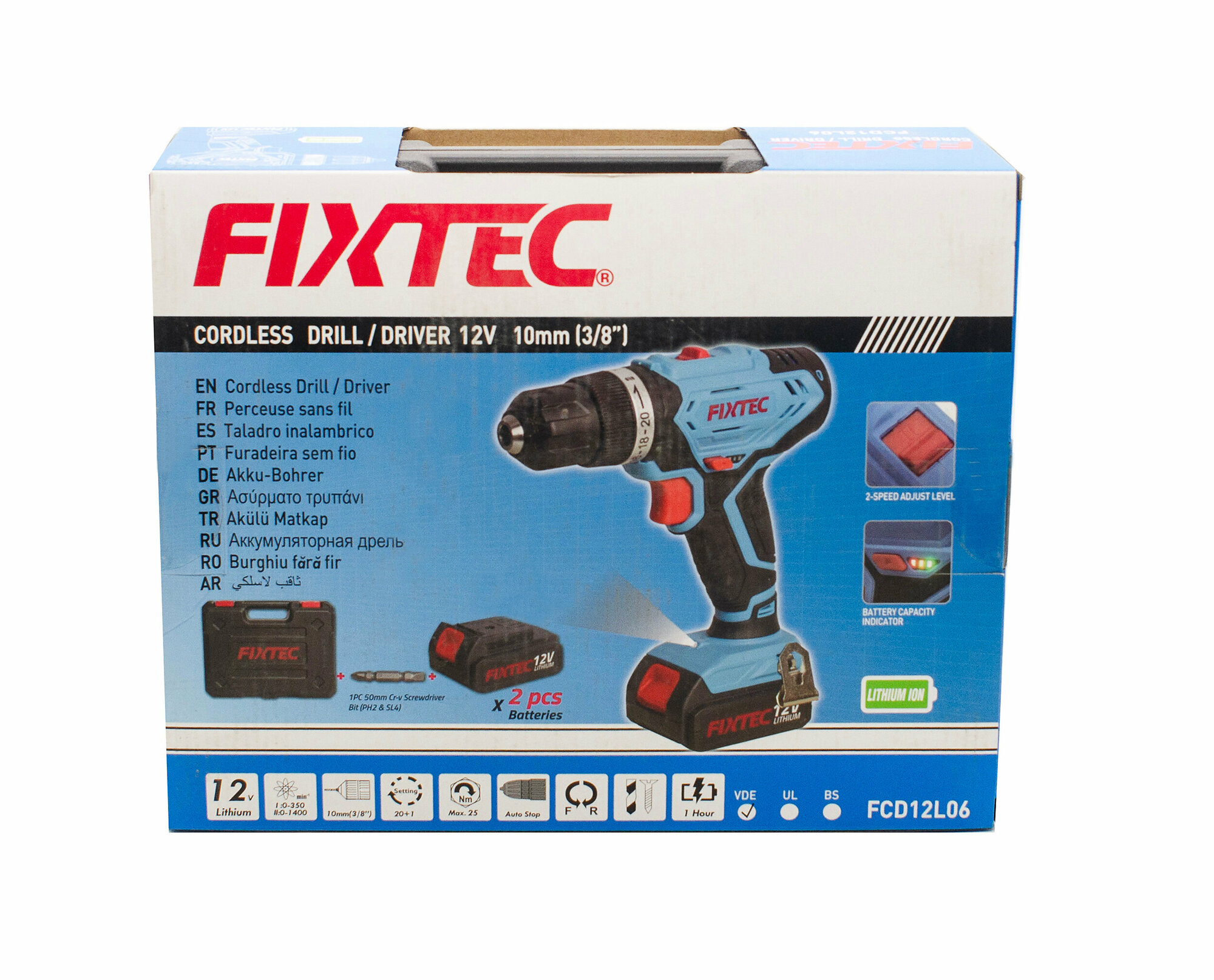Дрель аккумуляторная Fixtec FCD12L06, 12В, Li-ion,1,5А/ч, 2 аккумулятора