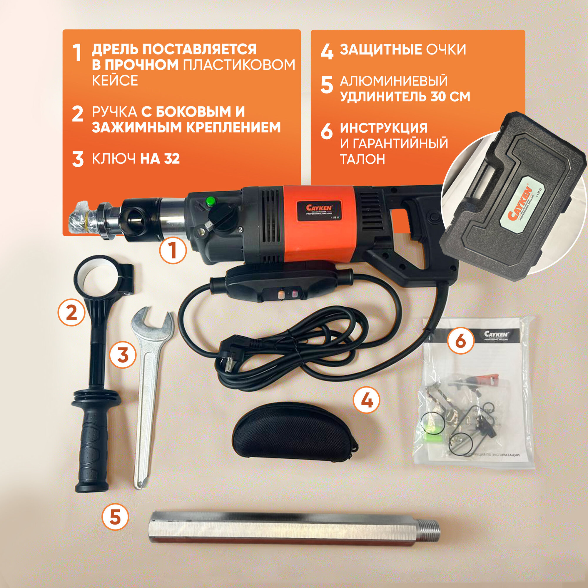 | Подробная комплектация | Дрель, удлинитель 30см , ручка с боковым и зажимным креплением, угольные щетки, ключ, очки и бируши, кейс, инструкция по эксплуатации. |