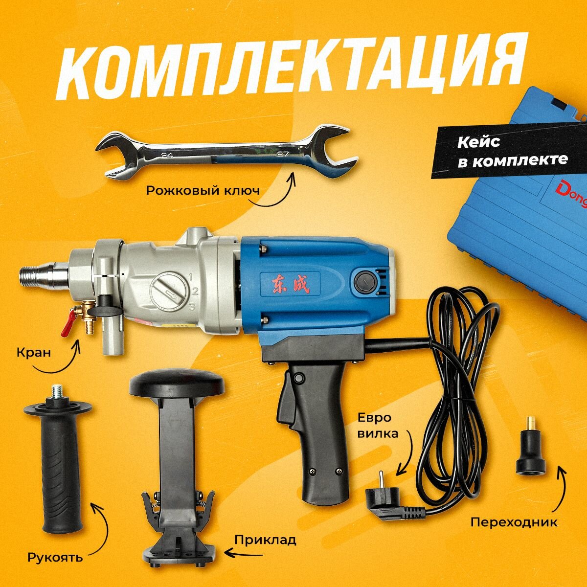 | Подробная комплектация | дрель, дополнительная рукоять, насадка на кран, муфта подачи воды, телескопический приклад, рожковый ключ, прочный кейс |