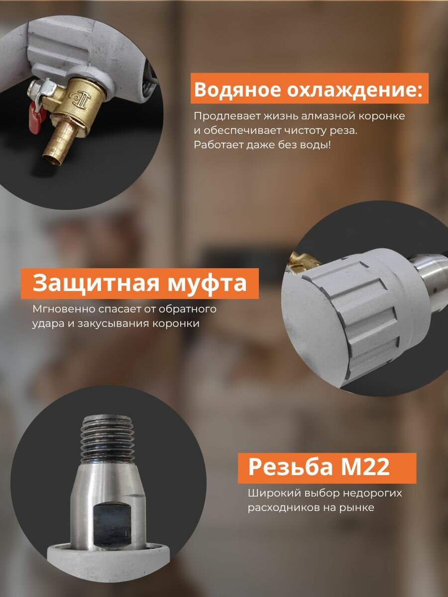 Ручная дрель алмазного сверления. Идеально подходит общестроительных работ, отделки, электромонтажа, монтажа сантехники, вентиляции, сплит-систем и др. Сверление возможно как в ручную, так и со станиной.
