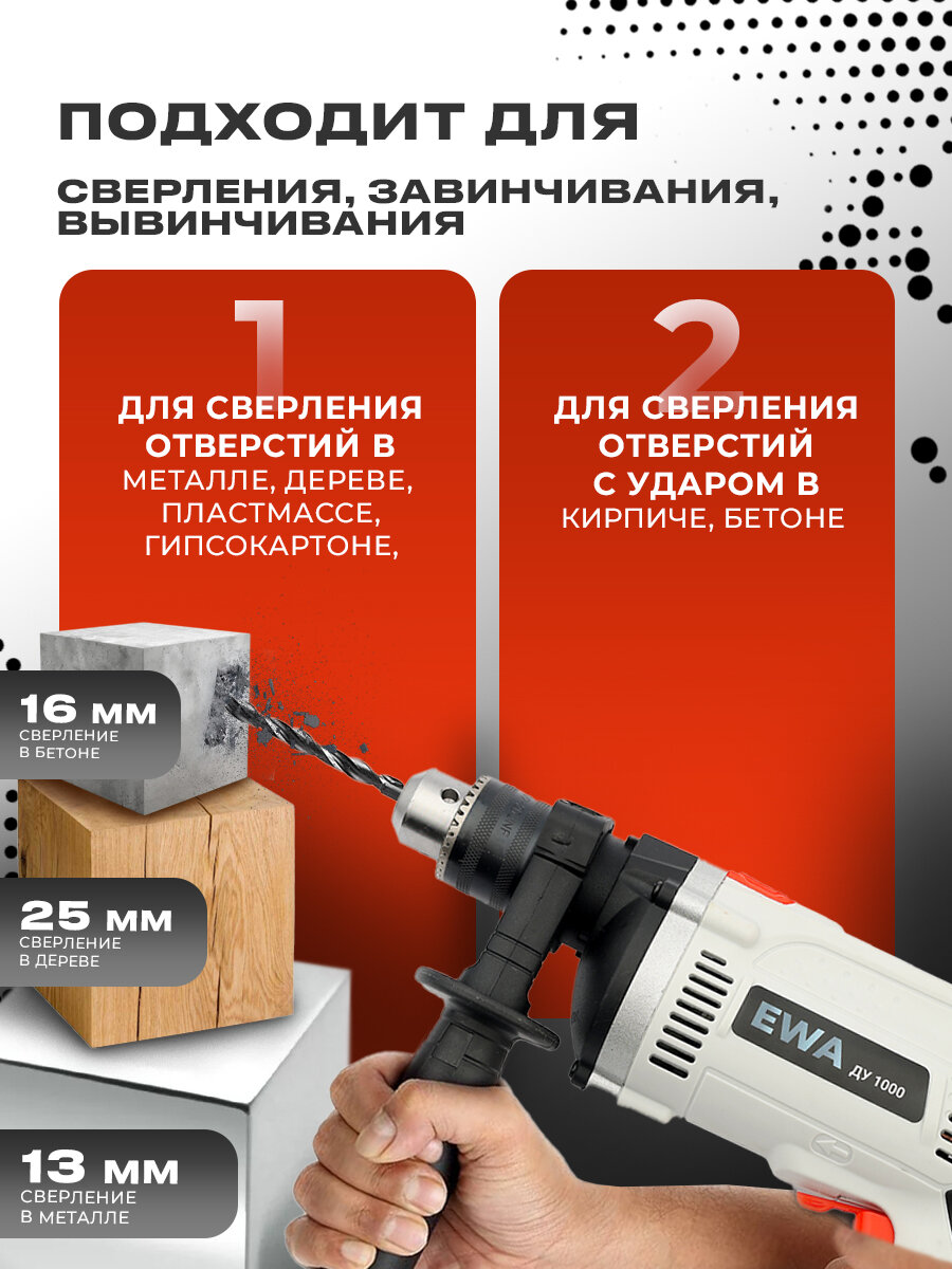 Электрическая дрель EWA ДУ 1000 – это не только мощный инструмент для профессионалов, но и отличное решение для любителей DIY-проектов. Благодаря реверсивному режиму вы сможете не только сверлить, но и откручивать крепежи, что делает ее особенно универсальным инструментом для любой мастерской.
