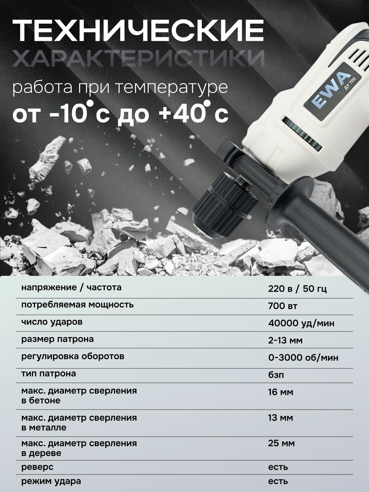 Технические характеристики, такие как мощность двигателя в 700 Вт и максимальная скорость в 3000 оборотов в минуту, подчеркивают эффективность этой ударной дрели. А благодаря возможности работы в ударном режиме, она становится универсальным инструментом для выполнения любых задач по строительству и ремонту. Пользователи ценят её за надежность и долговечность, которые гарантируют стабильную работу на долгие годы. Эта дрель станет незаменимым помощником как в профессиональных условиях, так и в домашней мастерской.