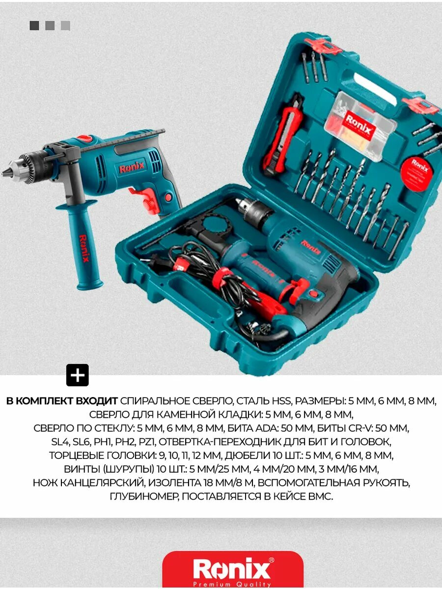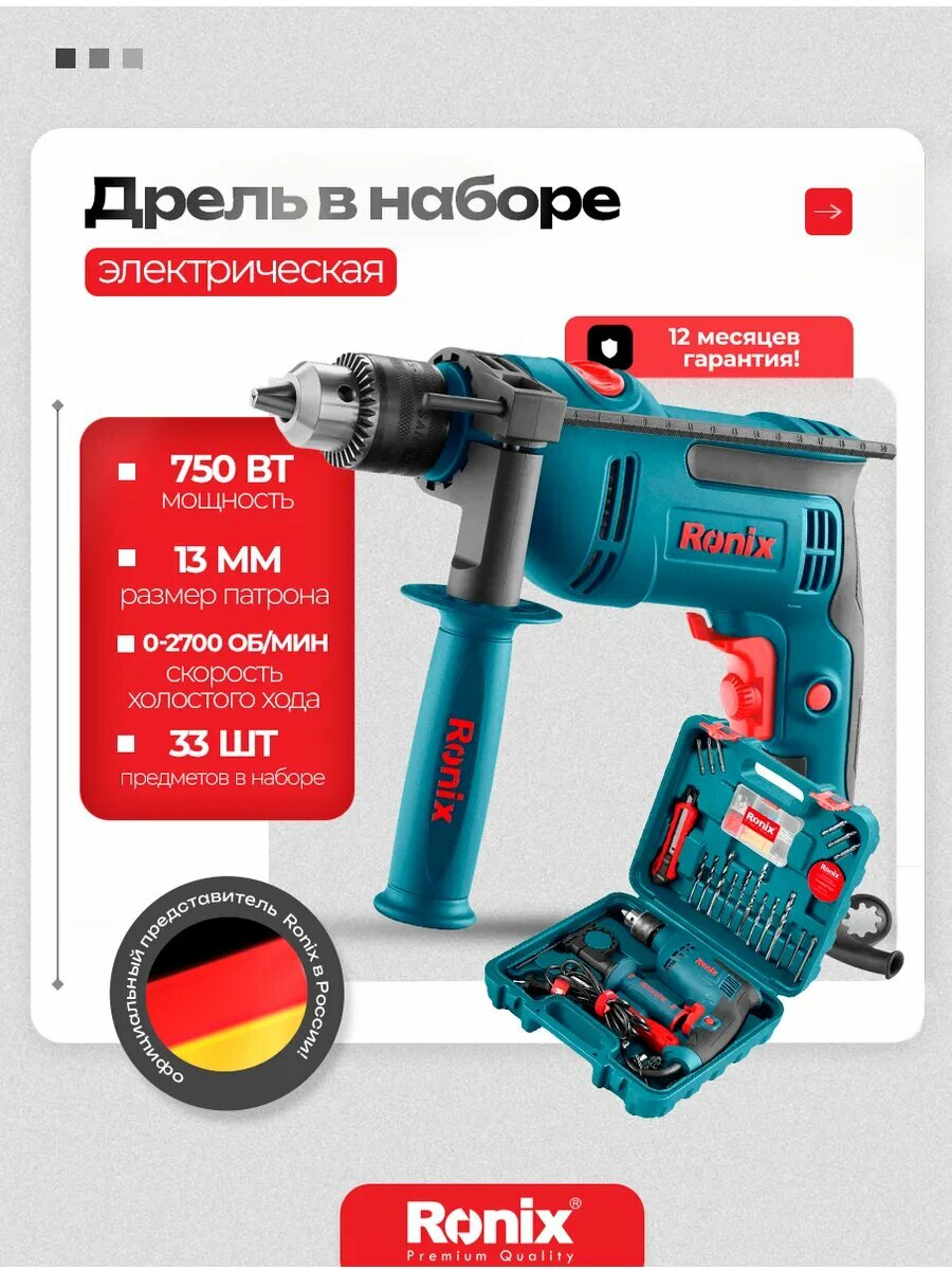 Дрель электрическая ударная Ronix с набором инструментов 750 Вт 13 мм 2700 об/мин: сравнение цен, характеристики, фото, актуальное наличие и цены.