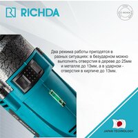 Дрель RICHDA RHDC1301 оснащена ударным механизмом и значительно расширяет возможности электроинструмента. Простое сверление позволяет работать с материалами невысокой плотности: деревом, пластиком, мягким металлом. Ударная функция облегчает просверливание кирпичной кладки, камня и легких бетонов.