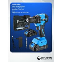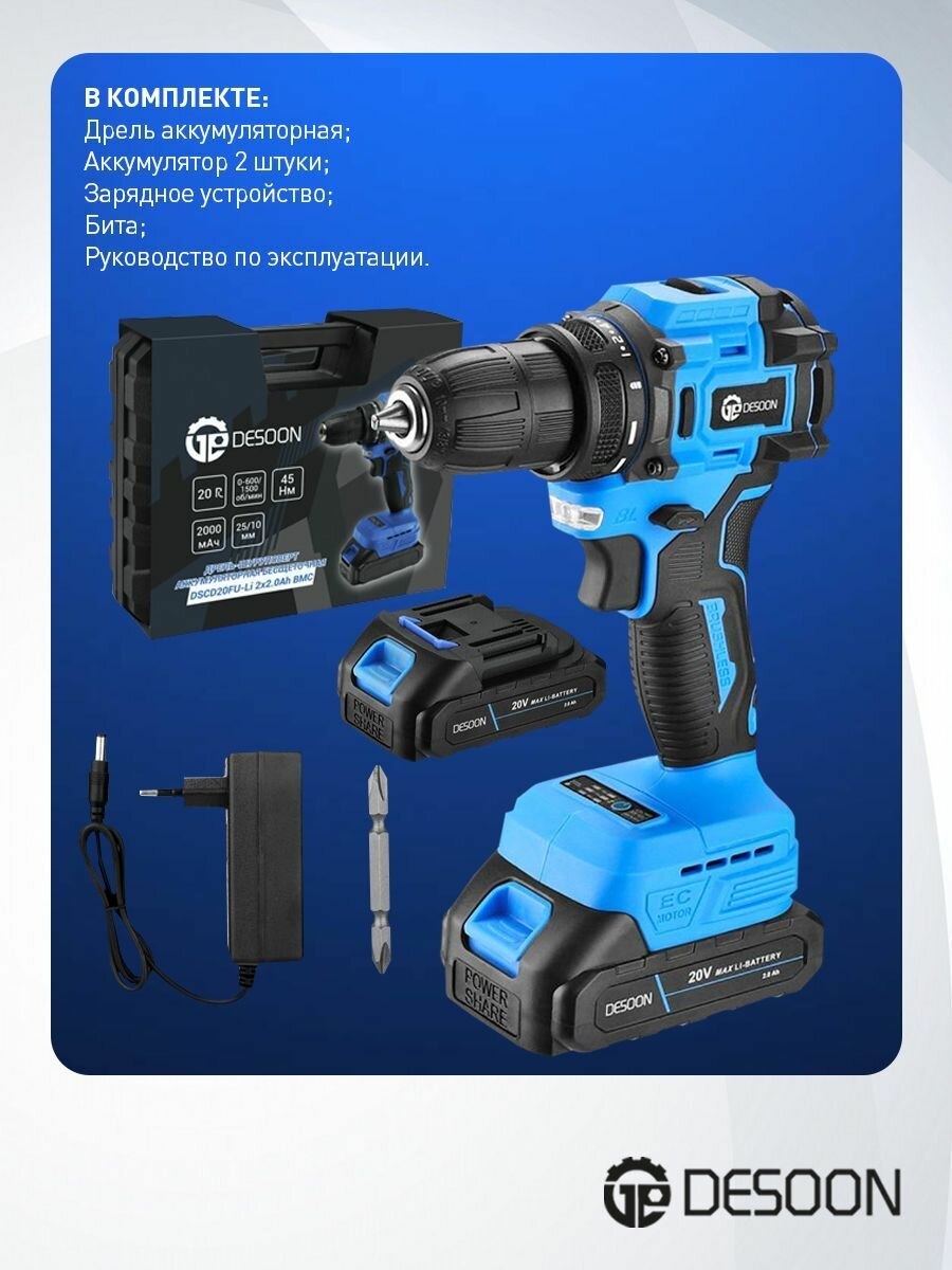Дрель-шуруповерт аккумуляторная бесщеточная DESOON DSCD20FU-Li предназначена для сверления отверстий в различных материалах (при установке соответствующих сверл для каждого вида работ), а также для монтажа/демонтажа резьбовых соединений (при установке соответствующих бит и головок).