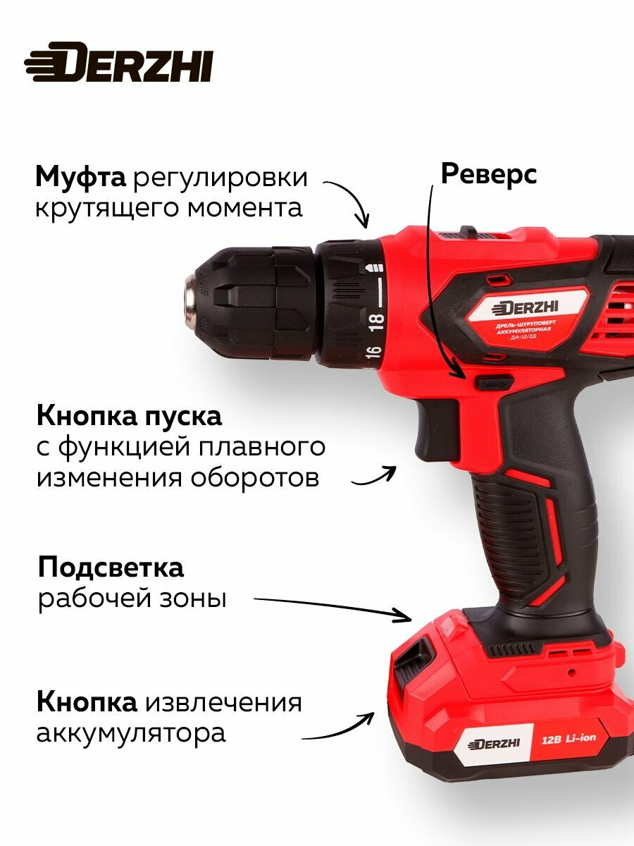 Дрель-шуруповерт аккумуляторная DERZHI 12В, 1500 об. в мин. 2 аккумулятора 28 Нм, подсветка -фонарик, кейс инструменты: сравнение цен, характеристики, фото, актуальное наличие и цены.