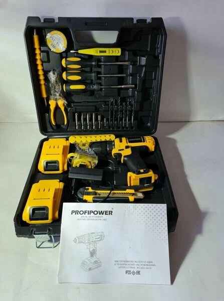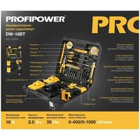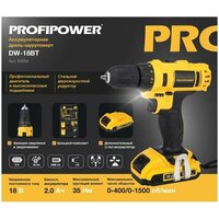 Дрель шуруповерт аккумуляторная щеточная Profipower 18В (АКБ 1шт. Li-Ion-2.0Ач, 35Нм, набор оснастки, в кейсе): сравнение цен, характеристики, фото, актуальное наличие и цены.