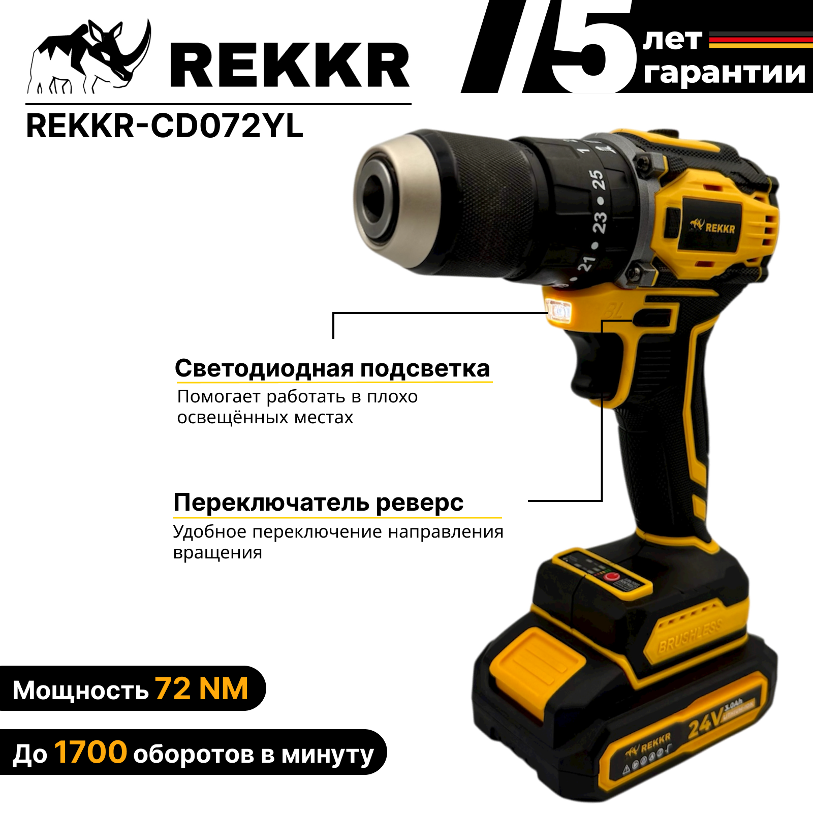 Дрель-шуруповерт бесщеточный REKKR CD072YL, 72Нм, 2 аккумулятора 24В 3.0Ач, железный патрон 13мм, кейс, зарядка: сравнение цен, характеристики, фото, актуальное наличие и цены.