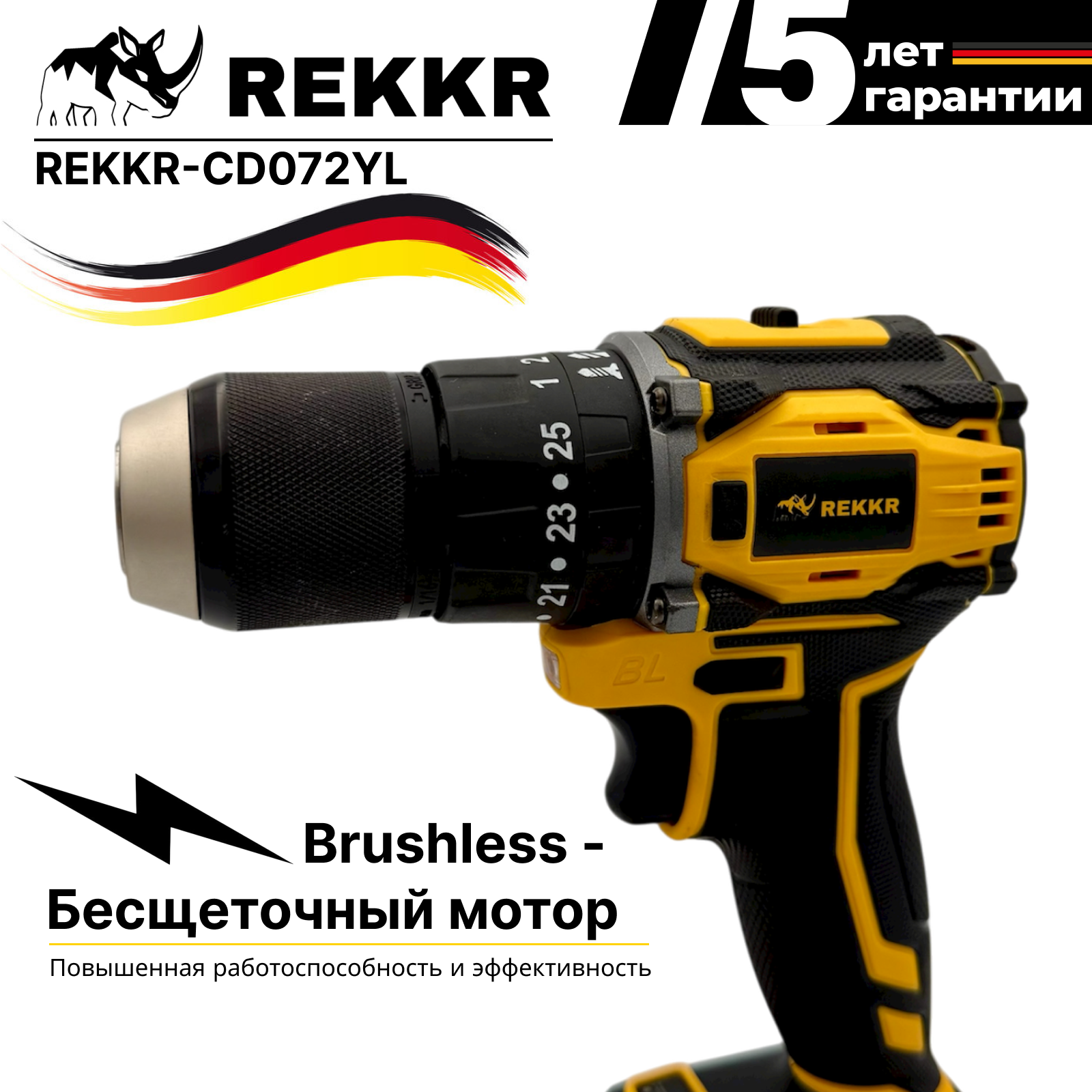Купить Дрель-шуруповерт бесщеточный REKKR CD072YL, 72Нм, 2 аккумулятора 24В 3.0Ач, железный патрон 13мм, кейс, зарядка с доставкой по всей России.