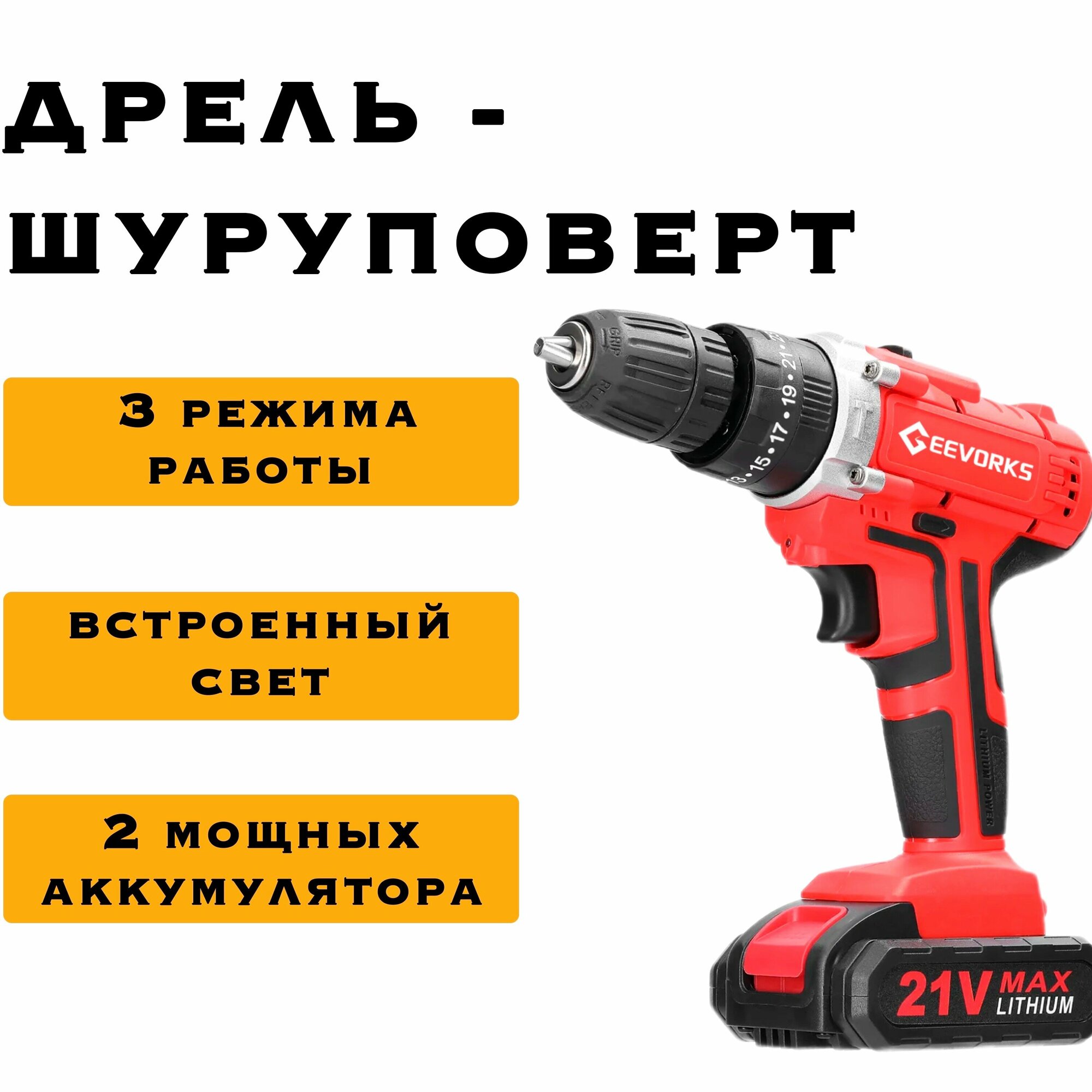 Купить Дрель-шуруповерт Geevorks 21В Li-ion , 3 режима работы, 2х1.5Ач от аккумулятора, 40 Нм с доставкой по всей России. Дрель-шуруповерт Geevorks 21В Li-ion , 3 режима работы, 2х1.5Ач от аккумулятора, 40 Нм: сравнение цен, характеристики, фото, актуальное наличие и цены.