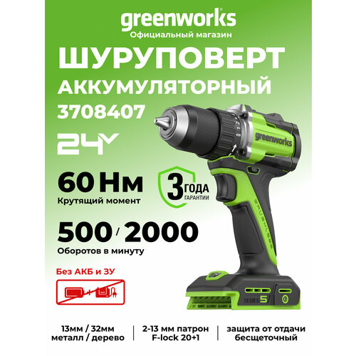 Дрель-шуруповерт акк. Greenworks DD560, 24V, б/щет, 30/60 Нм, 13мм, Antikickback, LED, без АКБ и ЗУ (3708407)