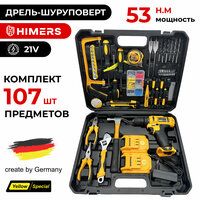 Дрель — шуруповерт HIMERS DF58Y аккумуляторный 21V, 2 АКБ, 53 Н. м / Версия Yellow special / Кейс с набором бит, свёрел, головок инструментов 107 предметов / для сверления, долбления, закручивания 21В
