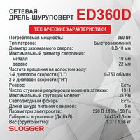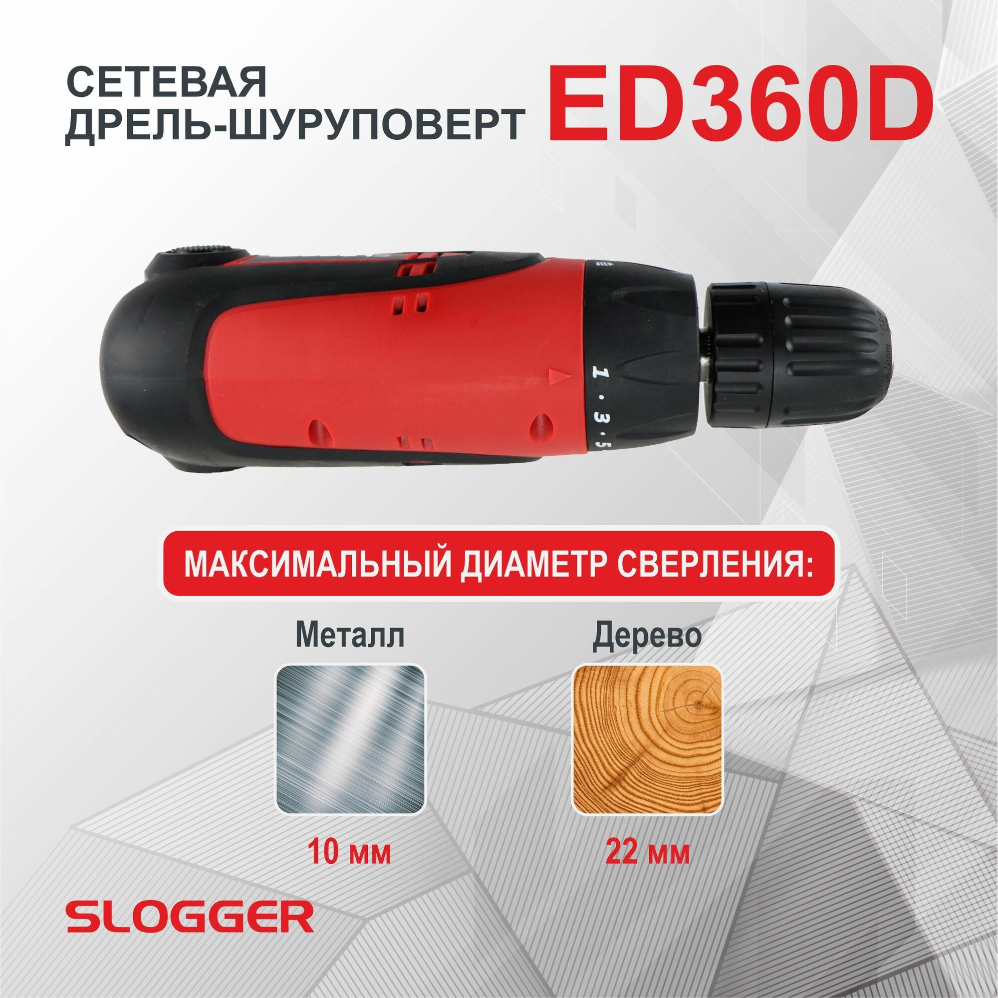 Дрель-шуруповерт сетевая Slogger ED360D, 360 Вт Реверс, 35 Hм, быстрозажимной патрон, светодиодный фонарь