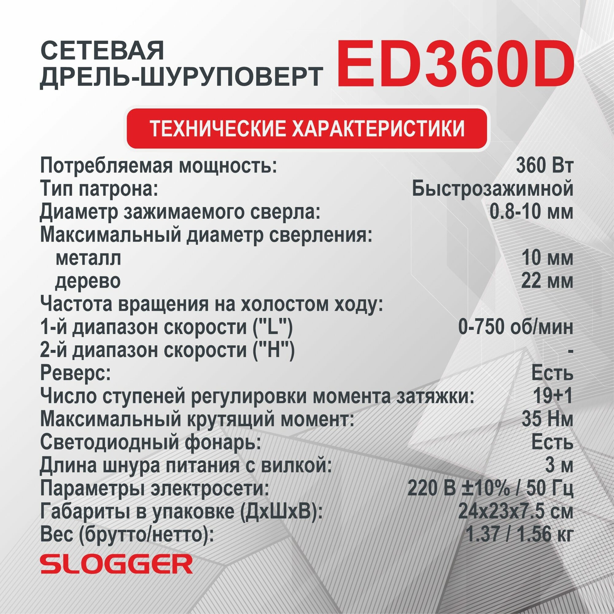 Дрель-шуруповерт сетевая Slogger ED360D, 360 Вт Реверс, 35 Hм, быстрозажимной патрон, светодиодный фонарь: сравнение цен, характеристики, фото, актуальное наличие и цены.