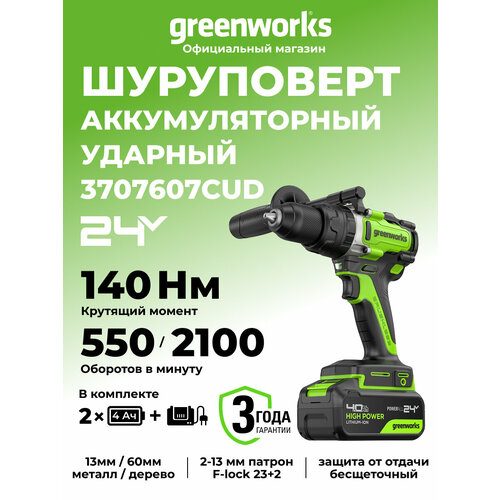 Дрель-шуруповерт ударная акк. Greenworks GD24DD140, 24V, б/щет, 70/140Нм, Anti-kickback, 2x4Ач, ЗУ, 3707607CUD. Самая мощная ударная дрель-шуруповерт Greenworks GD24DD140, с тремя рабочими режимами для работ в мастерской или на стройплощадке: сверление с ударом (ударная дрель), сверление без удара и заворачивание/отворачивание метизов. Эргономичный корпус из прочного полимера с нескользящим покрытием для комфортной работы. Встроенная интеллектуальная система защиты от отдачи Anti-kickback обеспечивает максимум безопасности во время работы, за счет автоматического отключения инструмента в случае заклинивания оснастки. Двухскоростной планетарный редуктор с металлическим корпусом обеспечивает высокую производительность и долгий срок службы. Быстрый переход между рабочими режимами обеспечивает отдельный переключатель, который позволяет сохранить неизменной настройку моментной муфты. Переставляемая боковая рукоятка, надёжно фиксируемая на металлическом корпусе редуктора. Бесщёточный двигатель DigiPro с цифровым управлением для долгого срока службы. Greenworks Intelligent Power – инновационная цифровая система контроля и управления батареей, инструментом и зарядным устройством обеспечивающая максимальную производительность и долгий срок службы. Яркая LED-подсветка рабочей зоны для комфортной работы в условиях слабой освещенности. Моментная муфта с широким диапазоном регулировки 23+2 ступени, для работы со всем ассортиментом метизов на стройплощадке. Стальной сверлильный патрон с диапазоном зажима 2.0-13 мм и фиксатором внешней втулки F-lock. Поясная клипса для практичной переноски на строительном объекте. Легко заворачивает 600+ конструкционных саморезов 4х60 мм в хвойную древесину от заряда аккумуляторной батареи 4 Ач. Технические данные: Платформа POWERALL 24V; Напряжение: 24V; Тип двигателя: бесщёточный DigiPro; Макс. мягкий / жёсткий крутящий момент: 70 / 140 Нм; Число оборотов холостого хода 1-я / 2-я ступень планетарного редуктора: 0-550 / 0-2100 об/мин; Макс. частота ударов: 9400 / 36000 уд/мин; Число ступеней регулировки момента (муфта): 23+2; Диапазон зажима сверлильного патрона 2,0-13 мм; Стальной сверлильный патрон; Макс. Ø метиза по дереву: 12 мм; Макс. Ø сверления в стали: 13 мм; Макс. Ø сверления в камне/кирпиче/бетоне: 13 мм; Макс. Ø сверления в древесине: 60 мм; Интеллектуальная система защиты от отдачи: Anti-kickback; Плавная регулировка частоты вращения; LED подсветка рабочей зоны; Переставляемая поясная клипса; Масса без акб: 1,8 кг; Масса с акб 4Ач: 2,6 кг. Рекомендуется использовать с батареями HIGH POWER емкостью от 4 Ач. Устройство совместимо со всеми АКБ платформы Greenworks POWERALL 24V; Гарантия на устройство 3 года; Гарантия на АКБ 2 года.