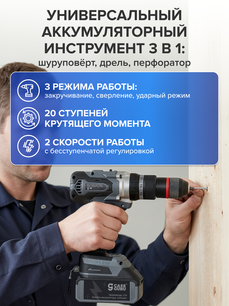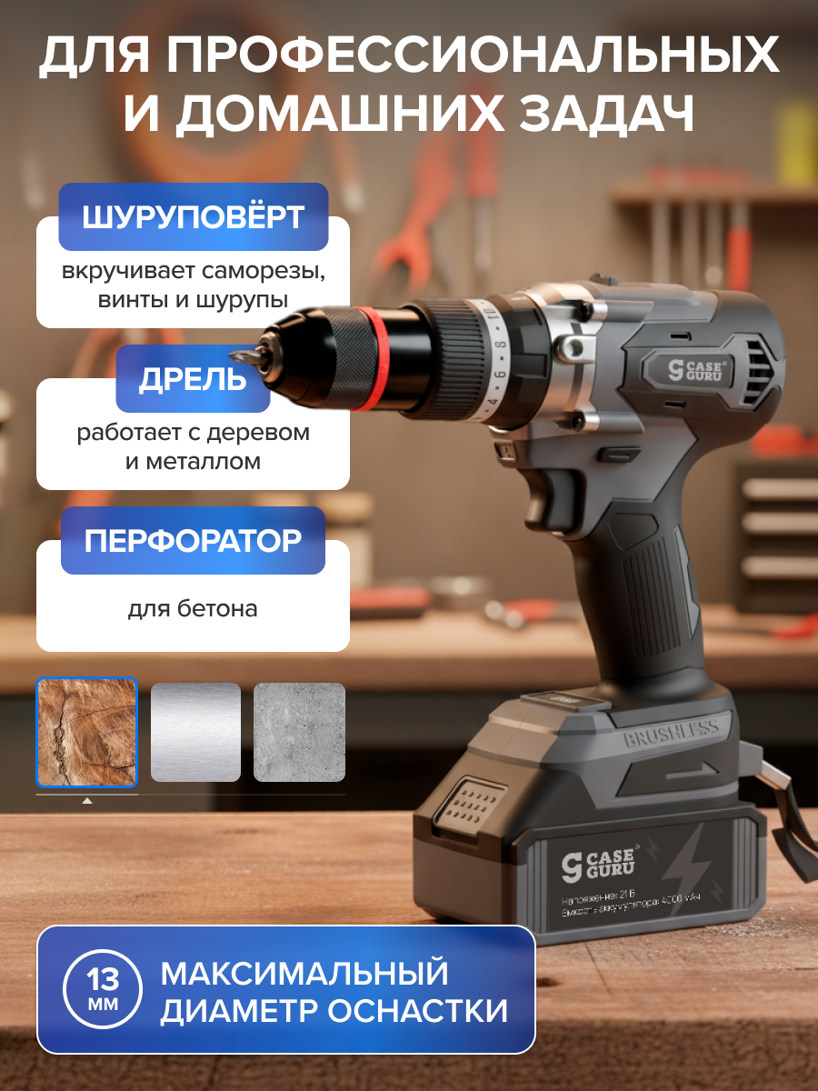 Купить Дрель-шуруповерт ударная аккумуляторная CaseGuru Шурик с 2 сменными АКБ и бесщеточным мотором с доставкой по всей России. Дрель-шуруповерт ударная аккумуляторная CaseGuru Шурик с 2 сменными АКБ и бесщеточным мотором: сравнение цен, характеристики, фото, актуальное наличие и цены.