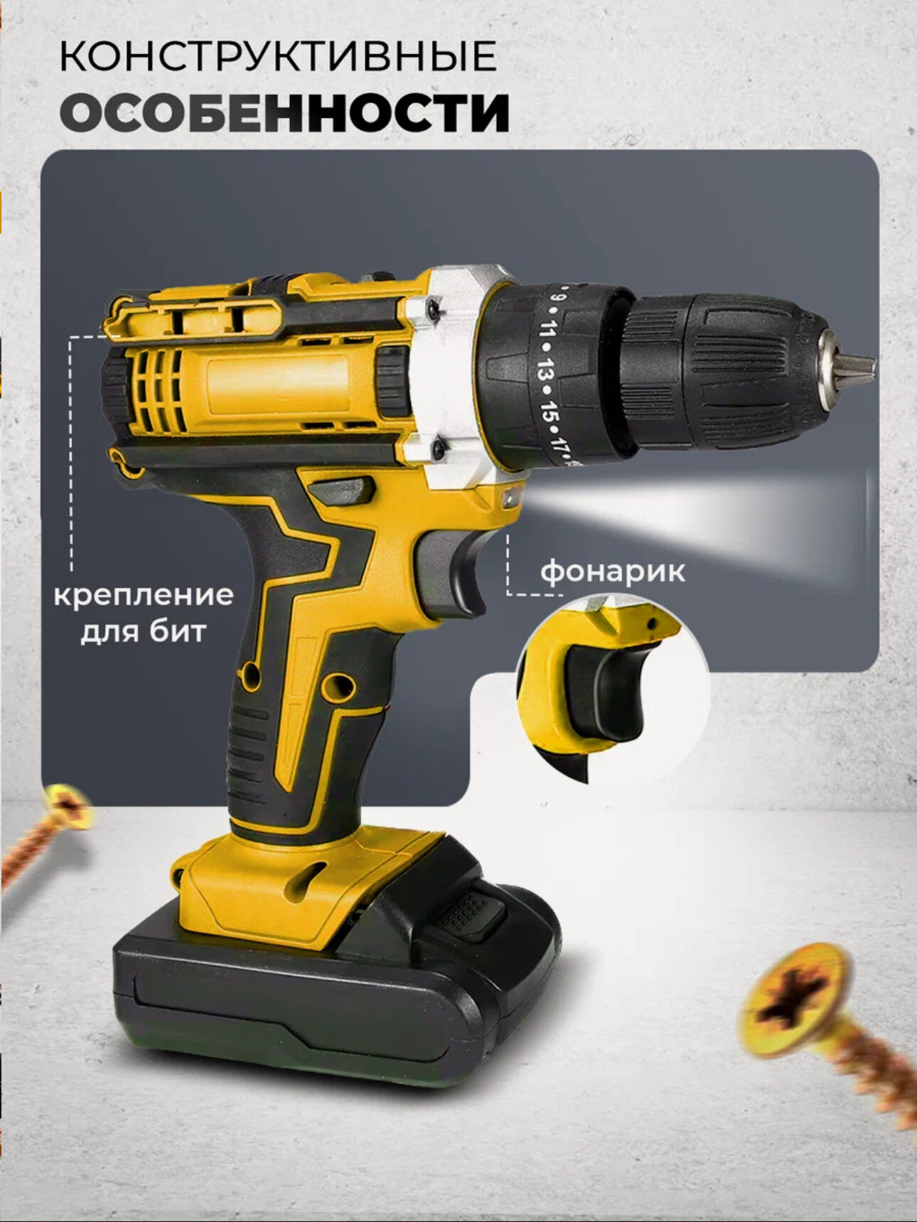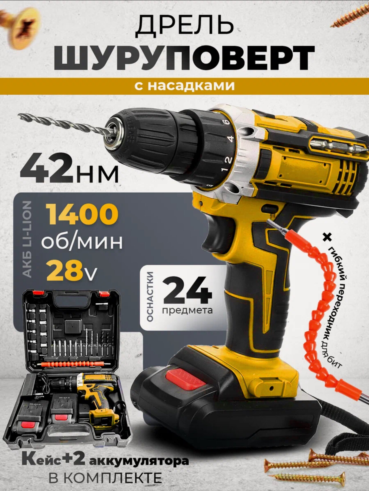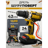Дрель-шуруповерт желтый с двумя аккумуляторами 2А, с набором и кейсом в комплекте: сравнение цен, характеристики, фото, актуальное наличие и цены.