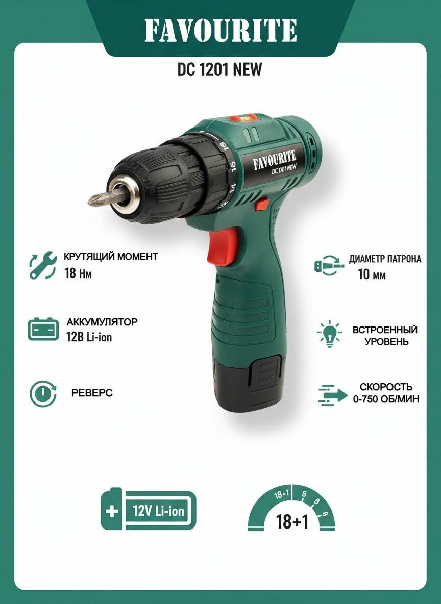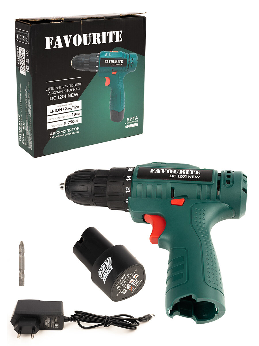 Дрель-шуруповёрт аккумуляторная Li-ion FAVOURITE DC 1201 NEW 12 В, 2 Ач, 18 Hm, 0-750 об/мин, АКБ и ЗУ: сравнение цен, характеристики, фото, актуальное наличие и цены.