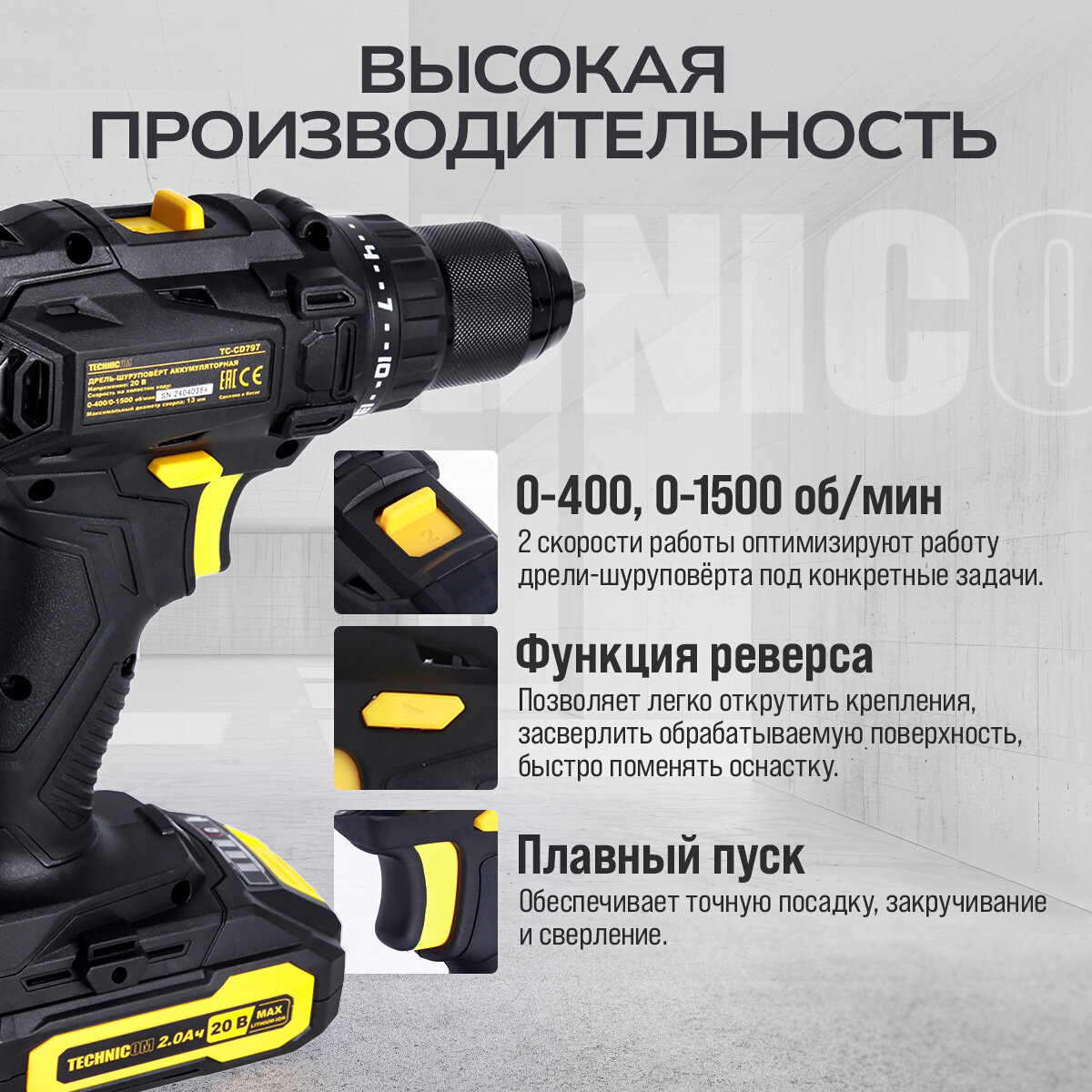 TC-CD797 – это аккумуляторная дрель-шуруповёрт, мощная и производительная, обладает, прекрасными характеристиками для использования как в быту, так и в профессиональной деятельности, прекрасно справляется с закручиванием саморезов и сверлением отверстий в бетоне, металле и дереве. В комплекте идёт несколько приятных бонусов, таких как набор бит, набор свёрл, поясное крепление.