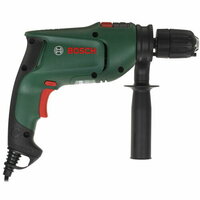 Сетевая ударная дрель Bosch EasyImpact 600 мощностью 600 Вт с настраиваемым числом оборотов до 3000 об/мин, ударным механизмом (до 45000 уд/мин), поможет сделать отверстия в бетоне до 12 мм, древесине 25 мм, стали 10 мм. Три рабочих режима: сверление, сверление с ударом и закручивание позволят выполнить домашнему мастеру любую работу, связанную с сверлением, закручиванием. Номинальный крутящий момент 1,4 Нм. Быстрозажимной патрон. Кабель 2,5 м. Электронная регулировка количества оборотов. Доставляется в чемодане с ограничителем глубины и дополнительной рукояткой. Особенности:Ударная дрель Bosch EasyImpact 600 поможет домашнему мастеру точно и удобно просверлить бетон, кирпич, древесину, металл, керамику, пластмассы.Дрель мощностью 600 Вт с регулируемым числом оборотов (до 3000 об/мин), ударным механизмом, обеспечивающим до 45000 уд/мин, реверсом, быстрозажимным патроном дает возможность выполнить любые работы по сверлению, закручиванию/откручиванию.Компактная модель весом 1,7 кг с прорезиненной рукояткой, сподручным расположением всех органов управления, с дополнительной рукояткой максимальна комфортна в работе.Доставляется в практичном для хранения и переноски инструмента чемодане.Мощность: 600 ВтМаксимальный диаметр сверления в бетоне: 12 ммМаксимальный диаметр сверления в древесине: 25 ммМаксимальный диаметр сверления в стали: 10 ммМаксимальный крутящий момент: НмНапряжение: 230 ВСерия: EasyImpactТип сверлильного патрона: быстрозажимной сверлильный патронУровень звукового давления: 96 дБ(А)Уровень звуковой мощности: 107 дБ(А)Частота вращения на холостом ходу: 0–3000 об/минЧисло ударов при номинальном числе оборотов: 45000 уд/минВес: кгУпаковка: пластиковый кейсВес в упаковке: кгГабариты упаковки: 386х292х112 ммСтрана производитель: ВенгрияОпрокидывающий момент в соответствии с EN 60745: 15,0 НмВыходная мощность (максимальная): 370 ВтКомплект поставки:Сетевая ударная дрель Bosch EasyImpact 600;Дополнительная рукоятка;Ограничитель глубины;Чемодан