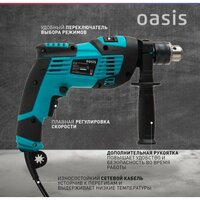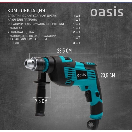 Дрель ударная электрическая Oasis предназначена для выполнения сверлильных работ в металле, дереве, пластмассе в режиме сверления; в бетоне, кирпиче и т. п. в режиме сверления с осевыми ударами. Электродрель обладает плавной регулировкой скорости и функцией реверса и ударным режимом для эффективного сверления различных материалов (может использоваться как шуруповерт, для завинчивания / вывинчивания винтов и шурупов, нарезания резьбы метчиками и т. д.). Ручная дрель имеет мощный износостойкий двигатель с системой охлаждения и защиту от пыли, что позволяет выдерживать чрезмерные нагрузки и обладает большим ресурсом. В комплект входят насадки на дрель, дополнительная удобная рукоятка и ограничитель глубины, делая сложную работу более комфортной. Ударная электро дрель обладает мягкими резиновыми накладками на рукоятке, которые снижают вибрацию и повышают комфорт пользователя. Дрель электрическая ударная станет вашим надёжным помощником в хозяйстве, подойдёт на подарок мужчине, коллеге, другу, мужу.