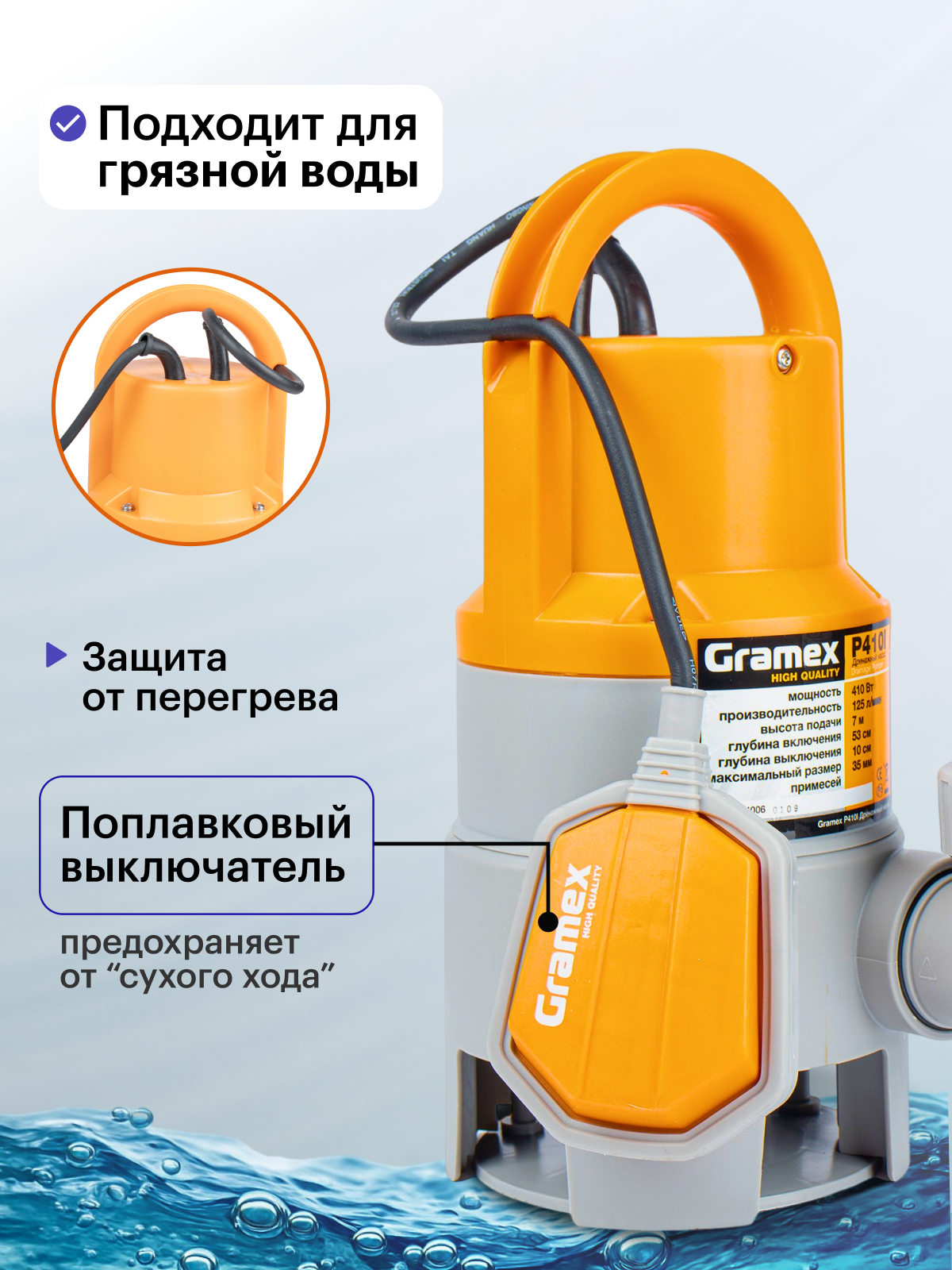 Купить Дренажный насос для грязной воды GRAMEX P410I / насос для воды погружной с поплавковым выключателем, 410 Вт, 125 л/мин с доставкой по всей России. Дренажный насос для грязной воды GRAMEX P410I / насос для воды погружной с поплавковым выключателем, 410 Вт, 125 л/мин: сравнение цен, характеристики, фото, актуальное наличие и цены.