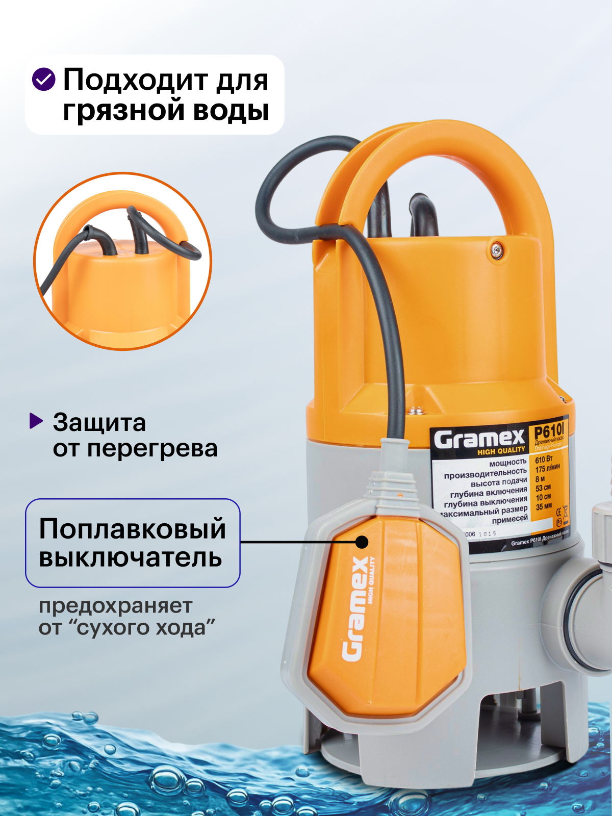 Купить Дренажный насос для грязной воды Gramex P610I / насос для воды погружной с поплавковым выключателем, 610 Вт, 175 л/мин с доставкой по всей России. Дренажный насос для грязной воды Gramex P610I / насос для воды погружной с поплавковым выключателем, 610 Вт, 175 л/мин: сравнение цен, характеристики, фото, актуальное наличие и цены.