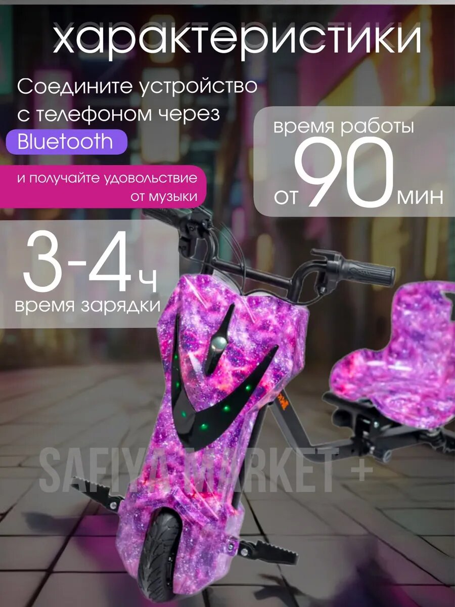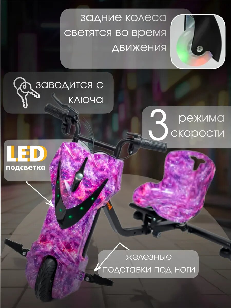 Дрифт карт Drift-Trike - это полноценный транспорт, который заводится ключом и разгоняется до 15 км/ч. С помощью электротранспорта для детей, каждый ребенек сможет почувствовать себя настоящим гонщиком. Маленькие колеса сзади управляют заносом электроскутера. Кататься на трицикле с аккумулятором можно везде - в парке, на площадке или заднем дворе. Устройство полностью безопасно для ребенка: при необходимости электрокарт с легкостью остановит ваш малыш нажав на рычаг тормоза и прекратить езду. Корпус дрифт машины Drift-Trike сделан из прочного пластика - в нем нет острых углов и выпирающих деталей. Каркас конструкции сделан из металла, поэтому кататься на электромобиле могут даже взрослые - он выдерживает до 100 кг нагрузки.