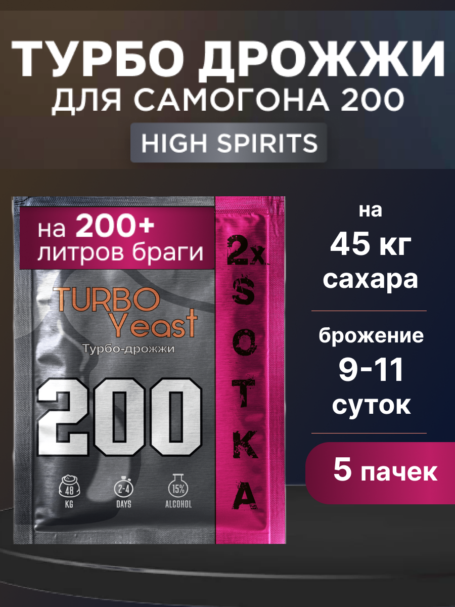 Хотите получить качественный спиртной напиток? Попробуйте наши турбо дрожжи High Spirits 200L! Они идеально подходят для создания вашего любимого алкоголя. Гарантируя качество и стабильно высокий выход спирта, без неприятных привкусов и ароматов. Каждый пакет дрожжи для самогона, содержит достаточное количество минералов, подкормок, витаминов, блокаторов сивушных масел и вредных примесей, что делает алкоголь безопасным для употребления. Имеют широкий диапазон рабочих температур, благодаря этому дрожжи спиртовые можно использовать в любых помещениях, в домашних условиях, и в профессиональных дистилляционных установках. Рекомендации по применению: Засыпьте необходимое количество сахара в воду t 30-35°С и хорошо размешать до полного растворения. Высыпьте содержимое пакетика, подождите 20 минут и перемешайте. Оптимальная температура брожения 24 - 30°С. Заходите в наш магазин, где вы найдете много полезных товаров для вашего хобби и идеи подарка мужчине (деду, папе) Продается в комплекте 5 шт