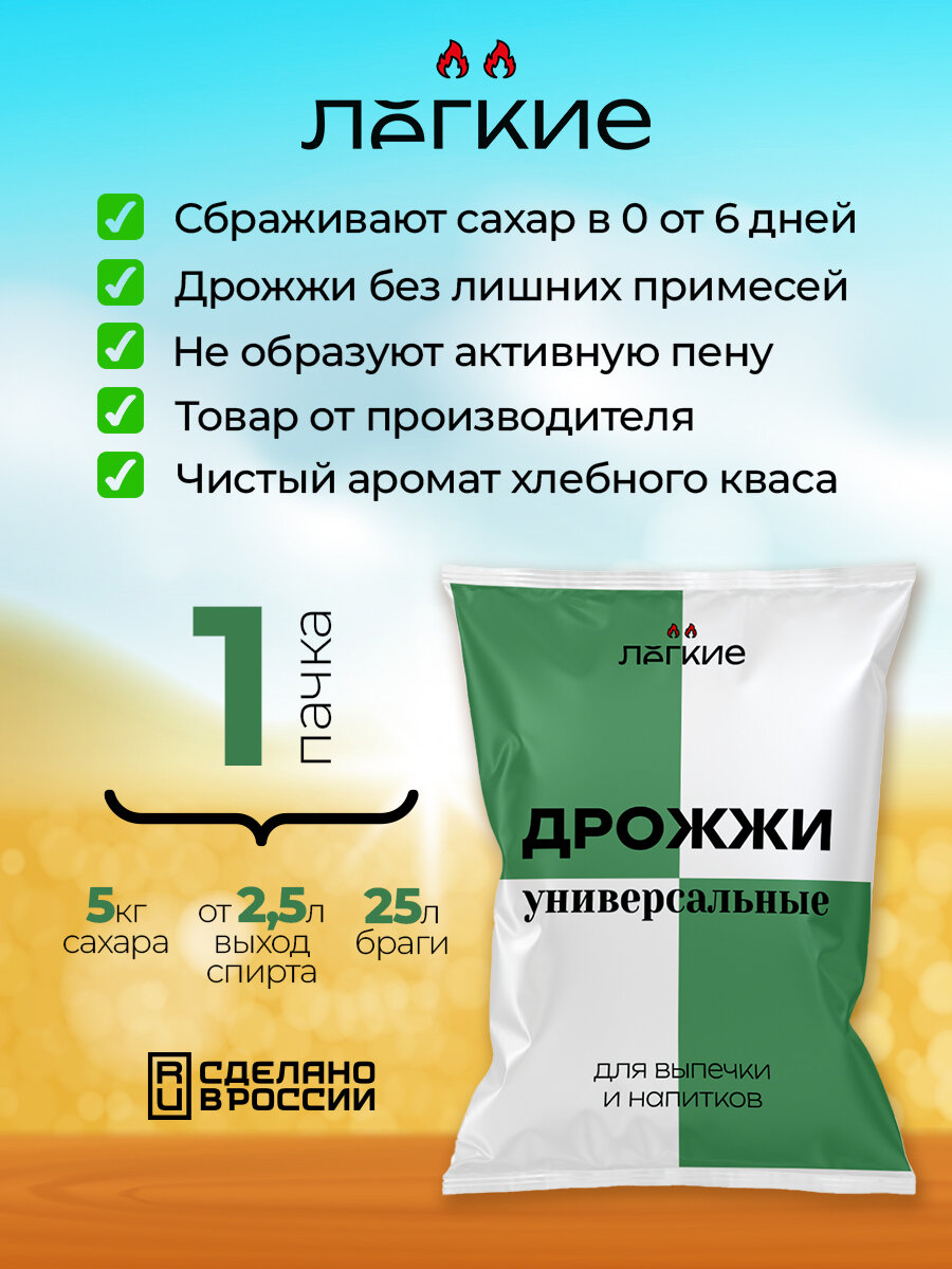 Универсальные дрожжи "Легкие" представляют собой экономичное и простое решение для приготовления качественной браги ( фруктовой, сахарной, зерновой) для дистилляции (самогона) и ректификации (водки, спирта).