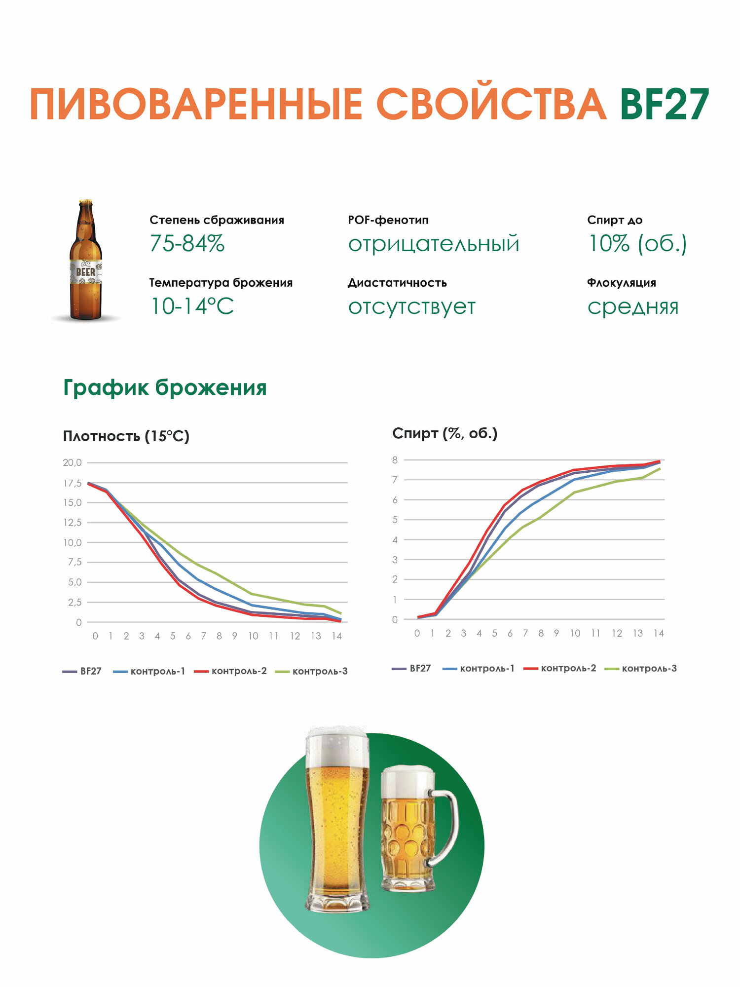 Описание: BF27 производится в рамках ряда строгих производственных процессов, в том числе выделения чистой размножающейся культуры, сепарации, сушки и т. п. В целом процессы отвечают требованиям международных законов в области безопасности пищевых продуктов и здоровья. BF27 являются отличными лагерными дрожжами и могут помочь производить лагер с дополнительным вкусом. Они представляют собой естественные штаммы без ГМО, которые классифицируется как Saccharomyces Cerevisiae. Они могут быть использованы в крафтовых пивоварнях и на небольших заводах пива. Температура брожения: 10~20℃ Инструкции по дозировке: От 50 до 100 г / гл, увеличение дозы вплоть до 100-300 г / гл при особых условиях брожения. Патогенные микроорганизмы: отсутствуют Пивоваренные свойства: Энергичное ферментация, высокое затухание и высокая флокуляция. Быстрое начало ферментации и возможность быстрого прекращения ферментации. Подходят для чистых и компенсированных лаггеров. Раскрывает едва уловимый фруктовый аромат без неприятных запахов и привкусов. Лучше всего использовать по традиционной лагерной рецептуре. Помогает получить освежающий вкус и прозрачный и яркий цвет. Температура ферментации: 10~20℃ Дозировка: От 50 до 100 гр/гл , увеличить дозу до 100 - 300 гр/гл при особых условиях ферментации Применение: Развести дрожжи кипяченой водой или разбавленным суслом (2:1 воды к суслу) в 5 ~ 10 раз от веса дрожжей при температуре 22 ~ 30 ℃ в дезинфекционной емкости. Аккуратно перемешать в течение 5 минут, чтобы полностью суспендировать дрожжи и оставить их на 10 ~ 20 минут. Затем отрегулировать температуру закваски до температуры сусла при наличии разницы температур выше 10 ℃ путем смешивания некоторого количества сусла. Незамедлительно внести закваску и смешать дрожжи и солод циркуляционным насосом. Весь этот процесс должен быть ограничен 30 минутами, чтобы уменьшить риск вторжения других микроорганизмов. Не обязательно насыщать воздухом сусло, чтобы помочь дрожжам достичь активного роста. Место хранения: Хранить при низкой температуре и в сухом месте, срок годности 24 месяца.