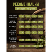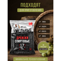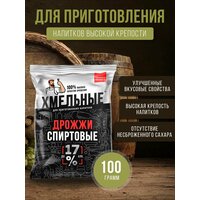 напитков с высокой крепостью и обладают рядом преимуществ перед другими марками дрожжей. Дрожжи спиртовые «Хмельные» отличаются улучшенными вкусовыми свойствами и высоким качеством готового продукта, а также отсутствием резкого запаха в процессе брожения. Брага, приготовленная на наших дрожжах, обладает высокой крепостью и отсутствием несброженного сахара. Для её получения необходимо соблюсти несколько простых условий: используйте очищенную воду и качественный сахар, вносите дрожжи при температуре сусла 33-35 °С , поместите ёмкость с брагой в затемненное место и поддерживайте температуру брожения от 24° до 28°С. Интенсивное брожение продолжается в течение 5-7 дней (5-6 кг сахара). Отличительная особенность дрожжей «Хмельные»:• Они обладают высокой толерантностью к самым разным видам сахаров, сбраживая их максимально качественно: без пены и посторонних запахов;• Обеспечивают хороший выход конечного продукта; • Выдерживают гидромодуль 1/3 и 17% спирта в браге;• Максимальную эффективность дрожжи проявляют, если процесс брожения проходит в помещении с температурой от +22°до +24 °С. Дозировка: одна 100-граммовая упаковка рассчитана на 22-32 литров воды и 6-8 кг сахара. Способ применения: Ёмкость для будущей браги заполнить тёплой водой (35-38°С, 15-20 литров) и развести в ней весь сахар. Долить холодную воду в сусло, температура которого должна быть 33-35°С и внести дрожжи. Оставить бродить в помещении с комфортной температурой 22-24°С. важно! Процесс брожения начинается в момент добавления дрожжей и при соблюдении всех условий, продолжается в течение 5-7 дней. Рекомендуем использовать очищенную воду. Брагу не пить. Дрожжи упакованы в герметичный пакет с фольгированным внутренним слоем, который сохраняет продукт активным в течение всего срока годности. Срок годности – 2 года.