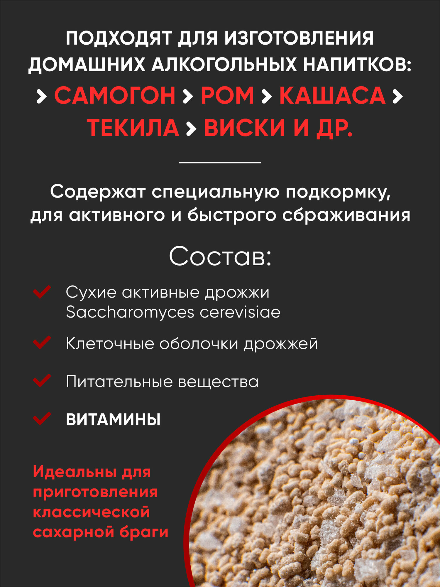 Дрожжи для самогона турбо – продукция, на 100% подходящая для производства алкоголя в домашних условиях. Речь идет о таких напитках, как виски, самогон, ром, текила, кашаса и других. В эту линейку входят разнообразные напитки, поэтому каждый может выбрать алкоголь по своим предпочтениям.