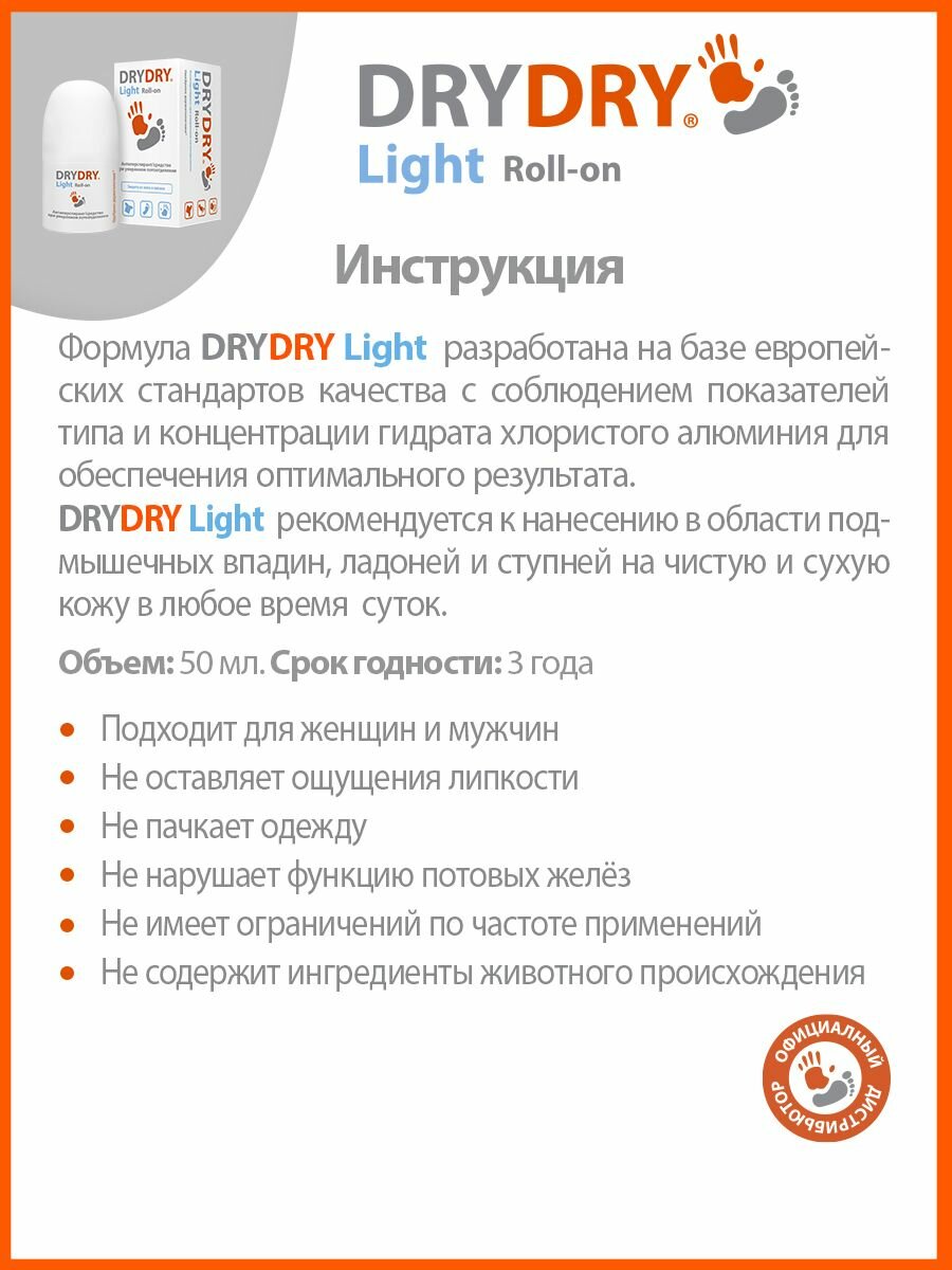 DRYDRY Light сочетает в себе силу классического DRYDRY Classic и деликатность DRYDRY Sensitive по отношению к коже. Не нарушает функции потовых желез, средство от пота блокирует потовые железы в обработанных местах, в результате чего происходит перенаправление выделения пота через поры других участков тела.