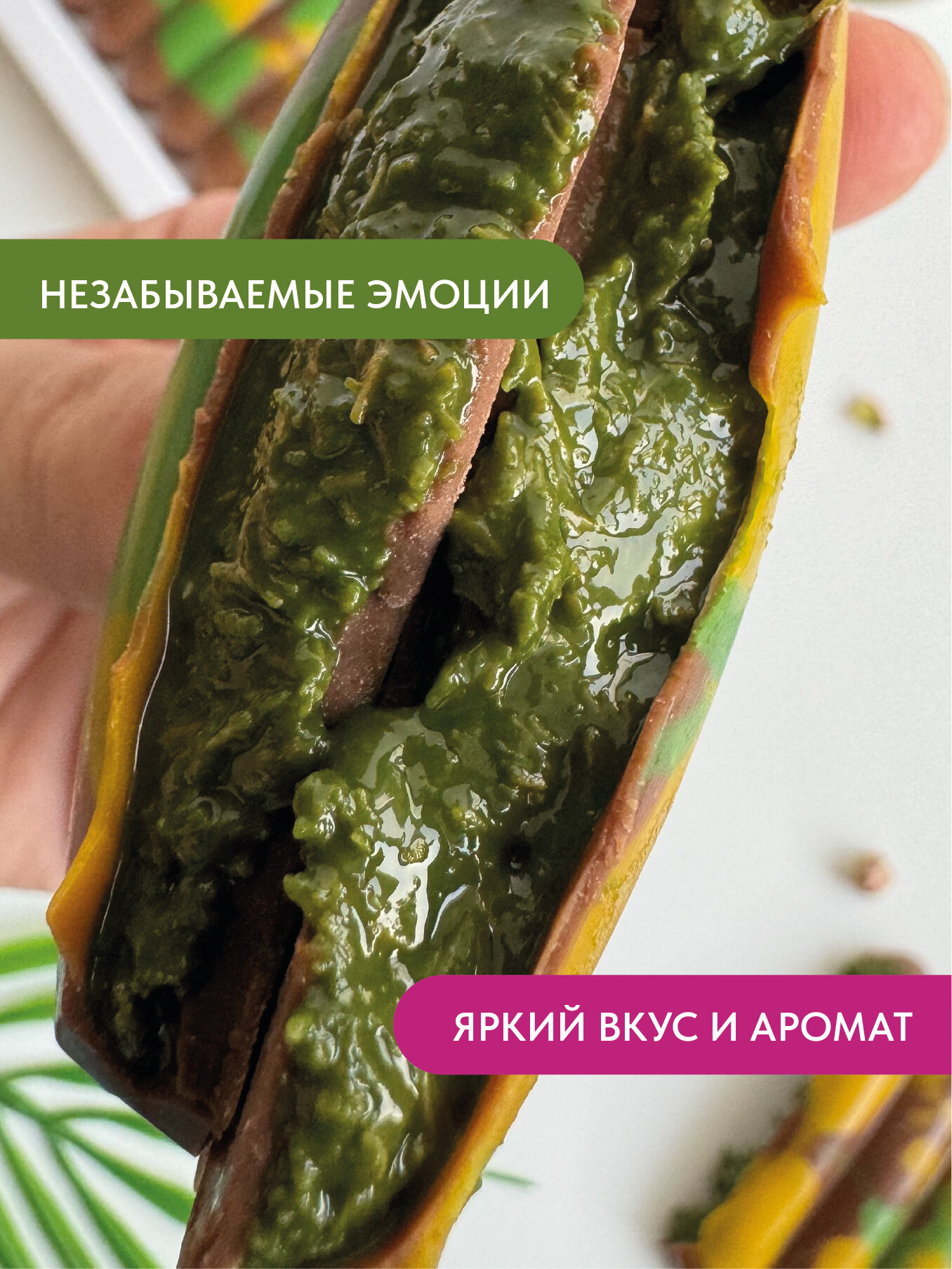 | Состав | какао тертое, цельное сухое молоко, масло какао, фисташковая паста, катаифи, тахини, сахар, мёд, эмульгатор лецитин соевый, ваниль. |