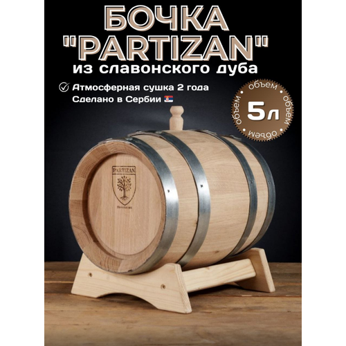 Дубовая бочка 5л Partizan (Сербия) изготовленная из славонского дуба, что известен своей прочностью и долговечностью, делающим его отличным выбором для выдержки и созревания домашних алкогольных напитков, таких как вино, самогон, кальвадос, бренди и другие.