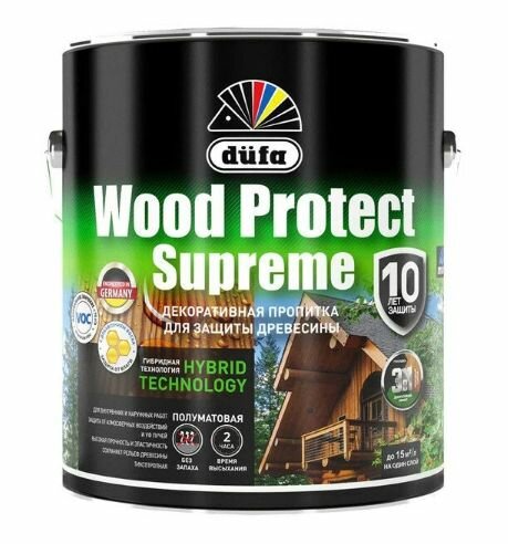 Технология Hybrid гарантирует глубокое проникновение и высокую прочность эмульсии алкида и быстрое высыхание, эластичность, долговечность и высокую экологичность акрилатной дисперсии. Твердый воск в составе способствует улучшенным водоотталкивающим свойствам пропитки, образует гидрофобное покрытие, а именно покрытие, которое отталивает воду. Формула 3-в-1 объединяет в одном продукте грунтовку (равномерное впитывание), защиту древесины (от УФ воздействий, плесени и синевы) и декоративный эффект (полуматовое покрытие, приятное на ощупь). Гибридная пропитка düfa WOOD PROTECT SUPREME защищает древесину до 10 лет. Применяется как для внутренних, так и наружных работ, защищает поверхность от атмосферных воздействий и УФ лучей. Пропитка практически не имеет запаха. Является лессирующей, т. е. подчеркивает красоту древесины и сохраняет рельеф; высокопрочной и эластичной; тиксотропной (наносится без потеков).